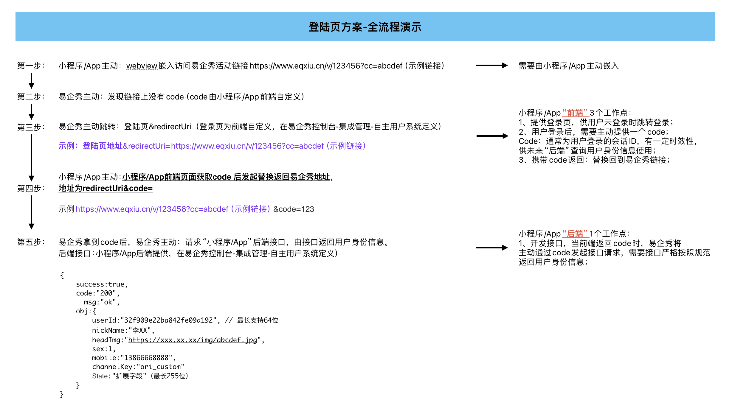 >1. 实现营销访客与企业自有用户关联 >1. 营销落地页可以使用企业用户数据 # 使用说明 1. 根据规范开发自定义授权页、以及获取用户信息接口 1. 登录控制台,服务集成模块,添加自有App集成配置,参见[自主用户系统配置](https://hc.eqxiu.cn/doc/206/ "自主用户系统配置") # 对接方式 一共有4中方式:授权页方式、code接口方式、参数方式、仅code方式。 ## 1. 授权页方式【推荐】 ### 交互流程图  ### 自定义授权页开发规范 - 页面业务逻辑: 1. 检测当前环境是否为自定义App,如果不是检测本地是否已安装App,唤起App或引导下载 1. 页面访问企业自有服务端,服务端生成临时code【一次使用有效】,code与当前登陆用户信息绑定,返回code。 1. 页面获取code 后发起重定向,重定向地址为redirectUrl&code=服务端生成的code,redirectUrl 为授权页的入参,即原作品链接地址。 - 注意: 重定向至第三方授权页请求**示例**: [https://muc.eqxiu.com/usercenter/login?corpOpenId=null&creationId=28280&creationType=hd&redirectUri=https%3A%2F%2Feqs.eqxiu.cn%2Fv%2F28280%3Fcc%3DTZ1bBRtX](https://muc.eqxiu.com/usercenter/login?corpOpenId=null&creationId=28280&creationType=hd&redirectUri=https%3A%2F%2Feqs.eqxiu.cn%2Fv%2F28280%3Fcc%3DTZ1bBRtX "https://muc.eqxiu.com/usercenter/login?corpOpenId=null&creationId=28280&creationType=hd&redirectUri=https%3A%2F%2Feqs.eqxiu.cn%2Fv%2F28280%3Fcc%3DTZ1bBRtX") 返回易企秀作品链接**示例**: [https://eqs.eqxiu.cn/v/28280?cc=TZ1bBRtX&code=xxxxxxx](https://eqs.eqxiu.cn/v/28280?cc=TZ1bBRtX&code=xxxxxxx) - 携带参数: | 参数名 | 是否必须 | 参数类型 | 参数说明 | | --- | --- | --- | --- | | corpOpenId | 否 | string | 平台型企业会携带,作品所属企业 | | creationId | 是 | Number | 作品id | | creationType | 是 | string | 作品类型,hd:互动,lc:长页,design:海报,h5:h5,form:表单 | | redirectUri | 是 | string | 发起授权的作品链接,授权后需跳转此地址 | ### 获取用户信息接口规范 - 方法类型:GET - 入参 | 参数名 | 是否必须 | 参数类型 | 参数说明 | | --- | --- | --- | --- | | code | 必填 | string | 企业服务生成的临时code,注意code不要包含=、/、\、&等特殊字符 | | XXX |非必填 | string | 动态字段,地址栏参数集合,如果企业需要其他字段,可以通过这个实现,例如在作品访问地址上拼接:customArgs1=111,该参数会出现 | |creationType | 必填 | string | 作品类型 | - 返回值 | 参数名 | 是否必须 | 参数类型 | 参数说明 | | --- | --- | --- | --- | | success | 必填 | boolean | 请求状态 | | code | 必填 | int | 请求状态码,200成功, | | msg | 必填 | string | 错误消息,正确是返回“ok” | | obj:userId | 必填 | string | 用户唯一id,**最长支持64位** | | obj:channelKey | 否 | String | 渠道编码;微信认证方式返回值为wx;手机号授权方式返回值为mo ;小程序授权方式返回值:ori_wxmp;APP授权方式返回值:ori_app;PC授权方式返回值:ori_pc (请根据您的实际情况返回值) | obj:nickName | 否 | string | 姓名或呢称 | | obj:headImg | 否 | string | 头像 | | obj:sex | 否 | int | 性别,1男,2女 | | obj:openId | 否 | String | 微信或其他第三方渠道 openId | | obj:unionId | 否 | String | 微信或其他第三方渠道 unionId | | obj:mobile | 否 | String | 手机号明文,11位数字 | | obj:mobileCipher | 否 | String | 手机号密文 | | obj:encryptionMethod | 否 | String | 加密方式:MD5、SHA1 | | obj:state | 否 | String | 扩展参数,返回后在访客明细可以查看和导出 | > 注意:当我们需要使用第三方风控服务时,必须要返回手机号或openId。 ```json { success:true, code:"200", msg:"ok", obj:{ userId:"32f909e22ba842fe09a192", // 最长支持64位 nickName:"李XX", headImg:"https://xxx.xx.xx/img/abcdef.jpg", sex:1, mobile:"13866668888", channelKey:"ori_custom" } } ```  ## 2. code接口方式【推荐】 ### 交互流程图  ### 获取用户信息接口规范 见“授权页方式” ## 3. 参数方式【不推荐】 ### 交互流程图  此方式无需接口,code为访客唯一标识,不能是临时的。==不安全== 。code最长支持==64位== ## 4. 仅code方式【不推荐】 ### 交互流程图  此方式与“参数方式基本一致”,仅参数区别,==不安全==。code最长支持==64位== ### 示例代码 github地址: