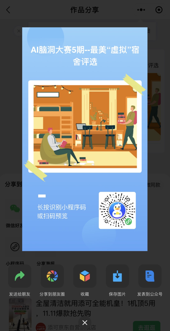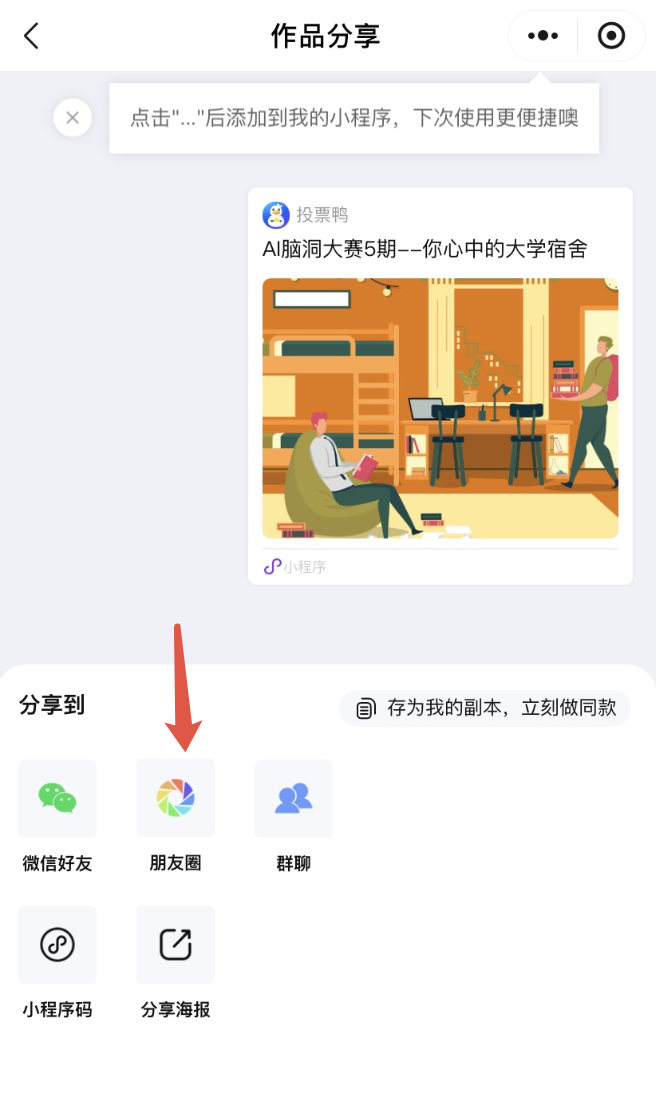 这是由于小程序限制,无法直接分享到朋友圈。我们可以按下述操作,快捷将作品分享到朋友圈:
