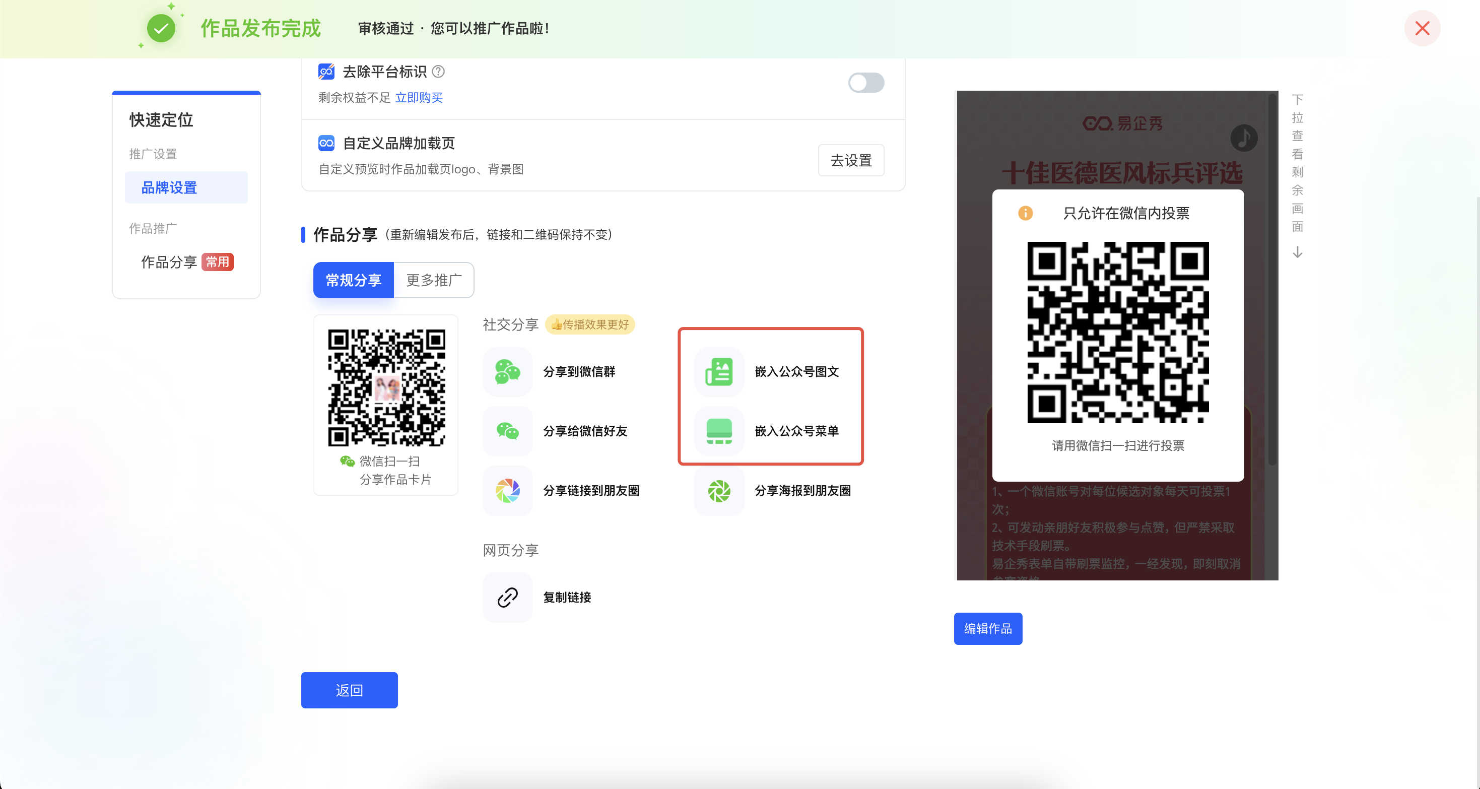 作品编辑好点击发布后,将进入编辑器发布页,如下界面所示,使用手机微信扫码,作品将在小程序中打开。