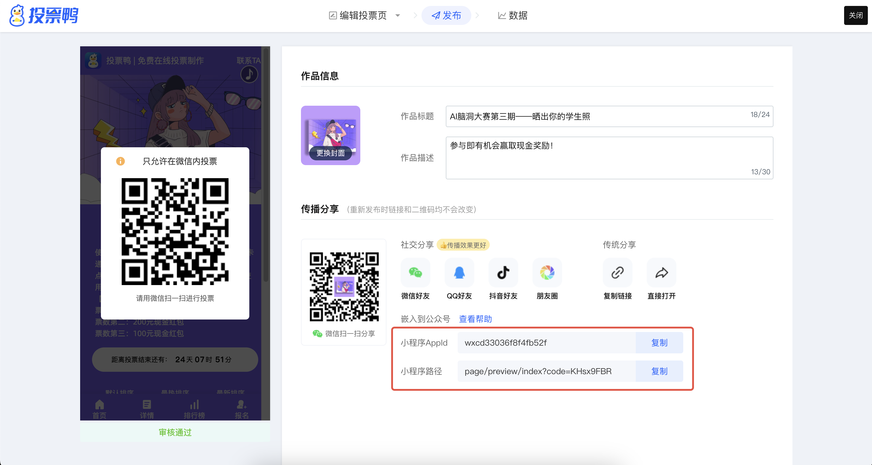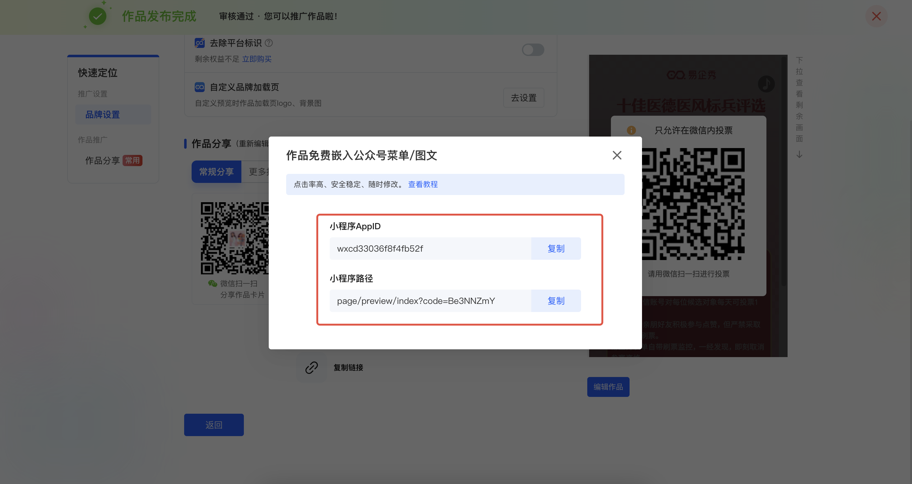 2.1、作品编辑发布后,在发布页面上,即可直接看到该作品的小程序路径以及小程序APPID。