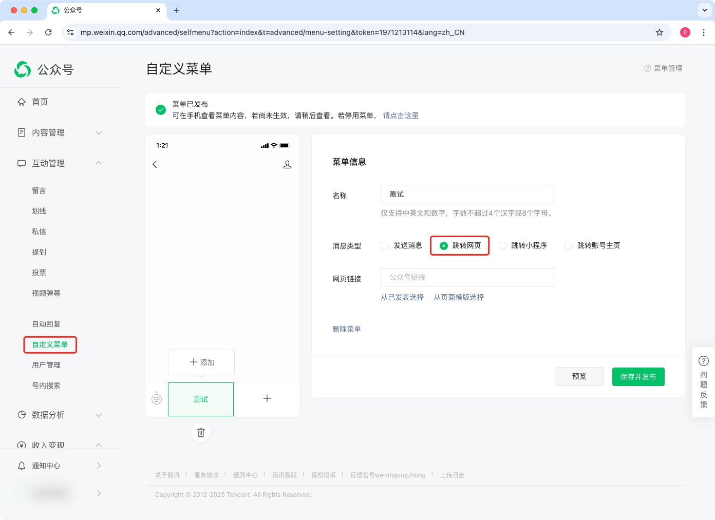 在“菜单内容”中选中“跳转网页”,并输入“页面地址”(粘贴从第一步中复制来的链接),点击“保存并发布”。