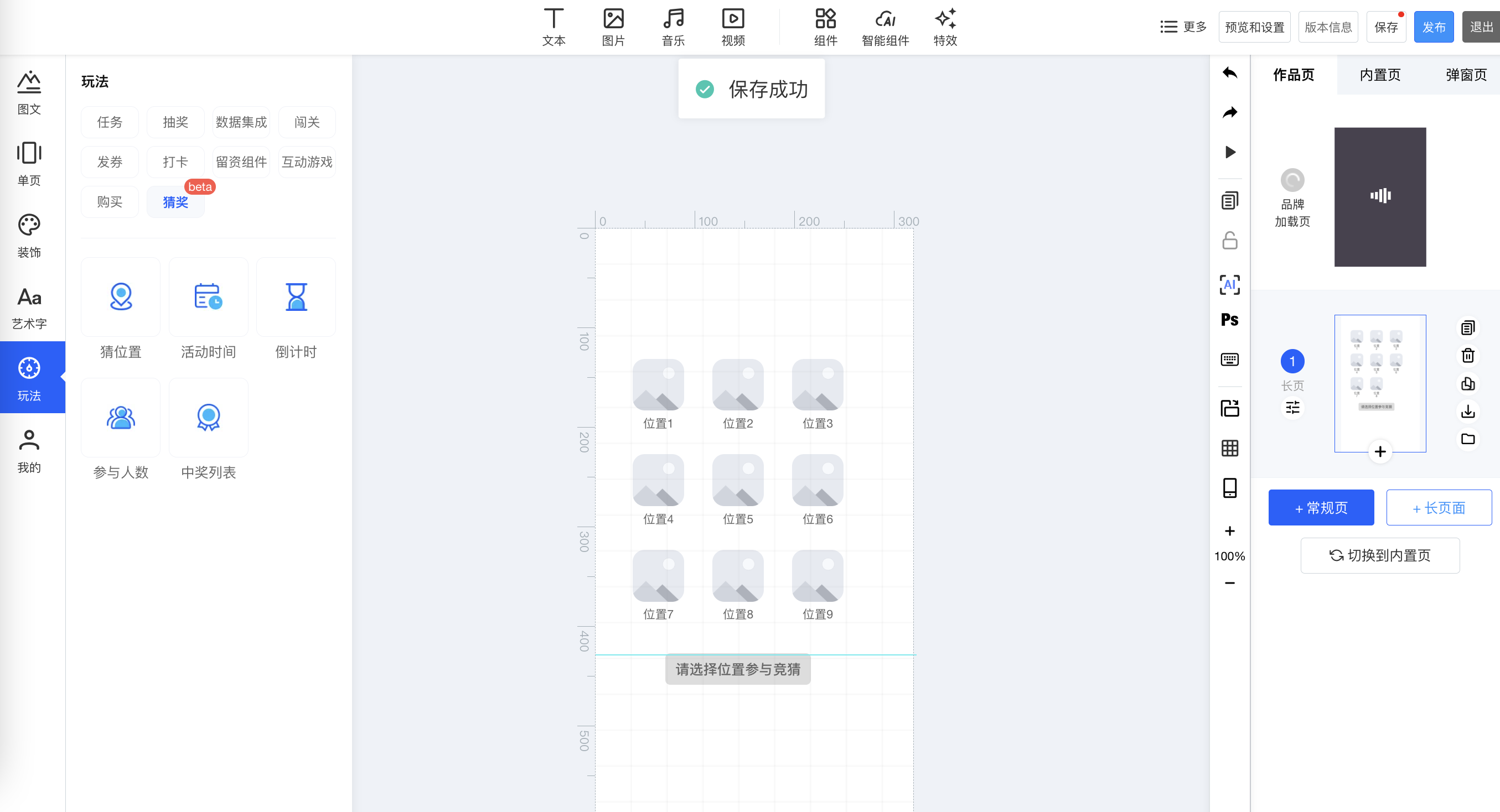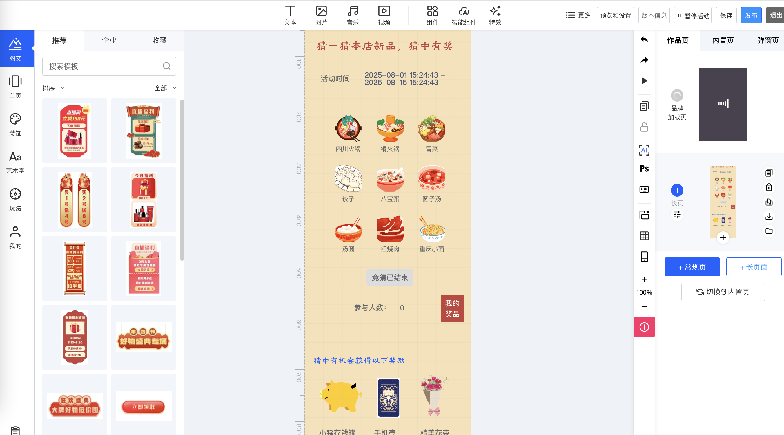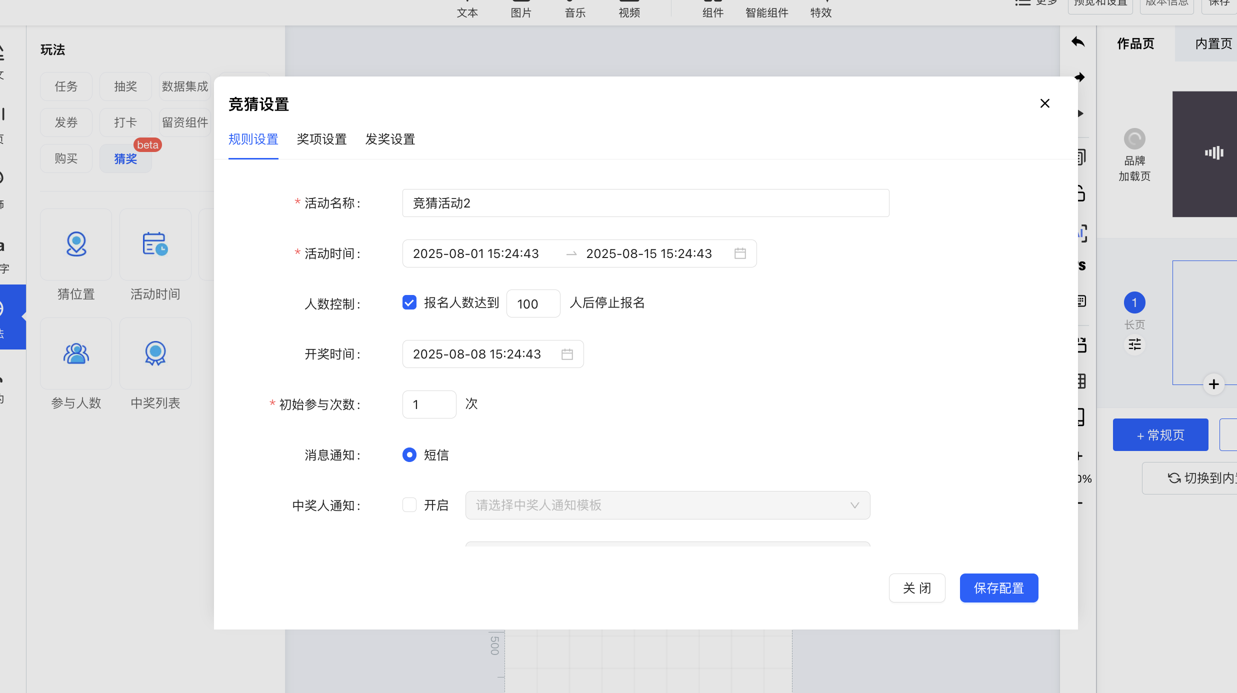 设置完规则之后,需要在画布中添加相应的组件,比如活动时间、倒计时、参与人数和中奖列表,并根据自己的需求美化页面(后续我们会增加猜奖模板)