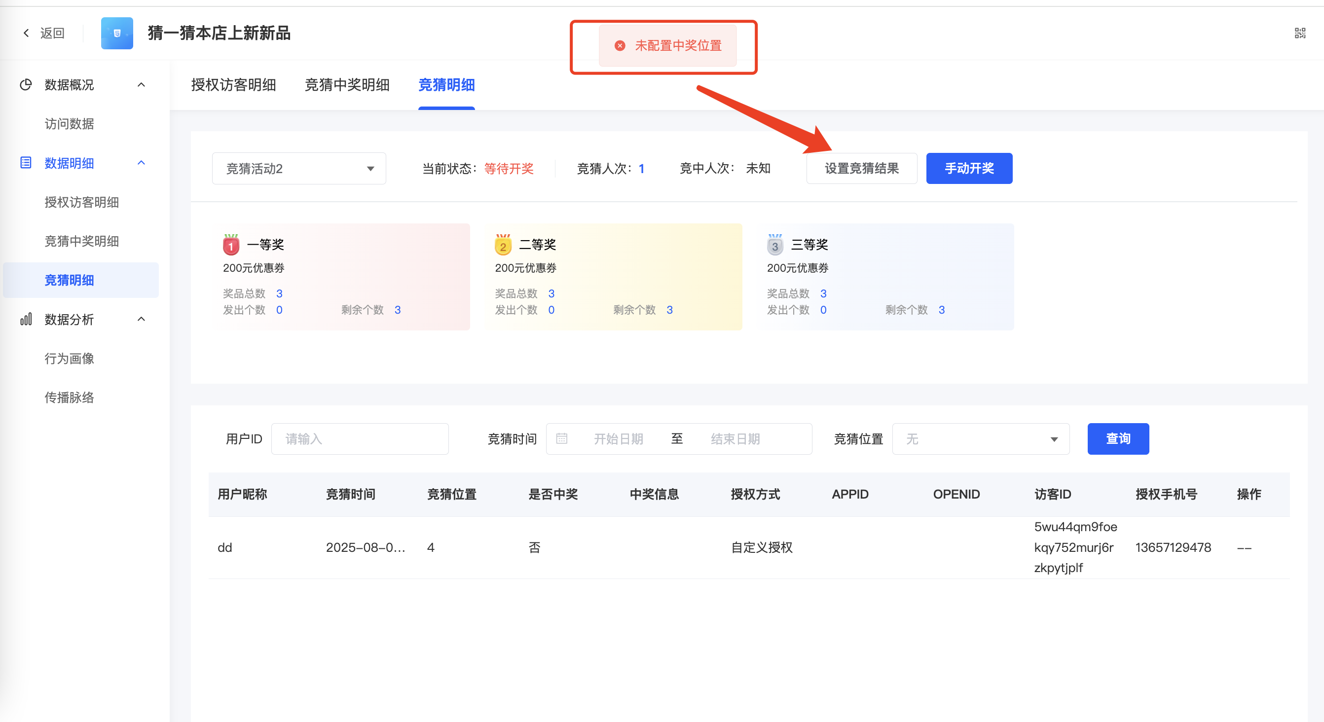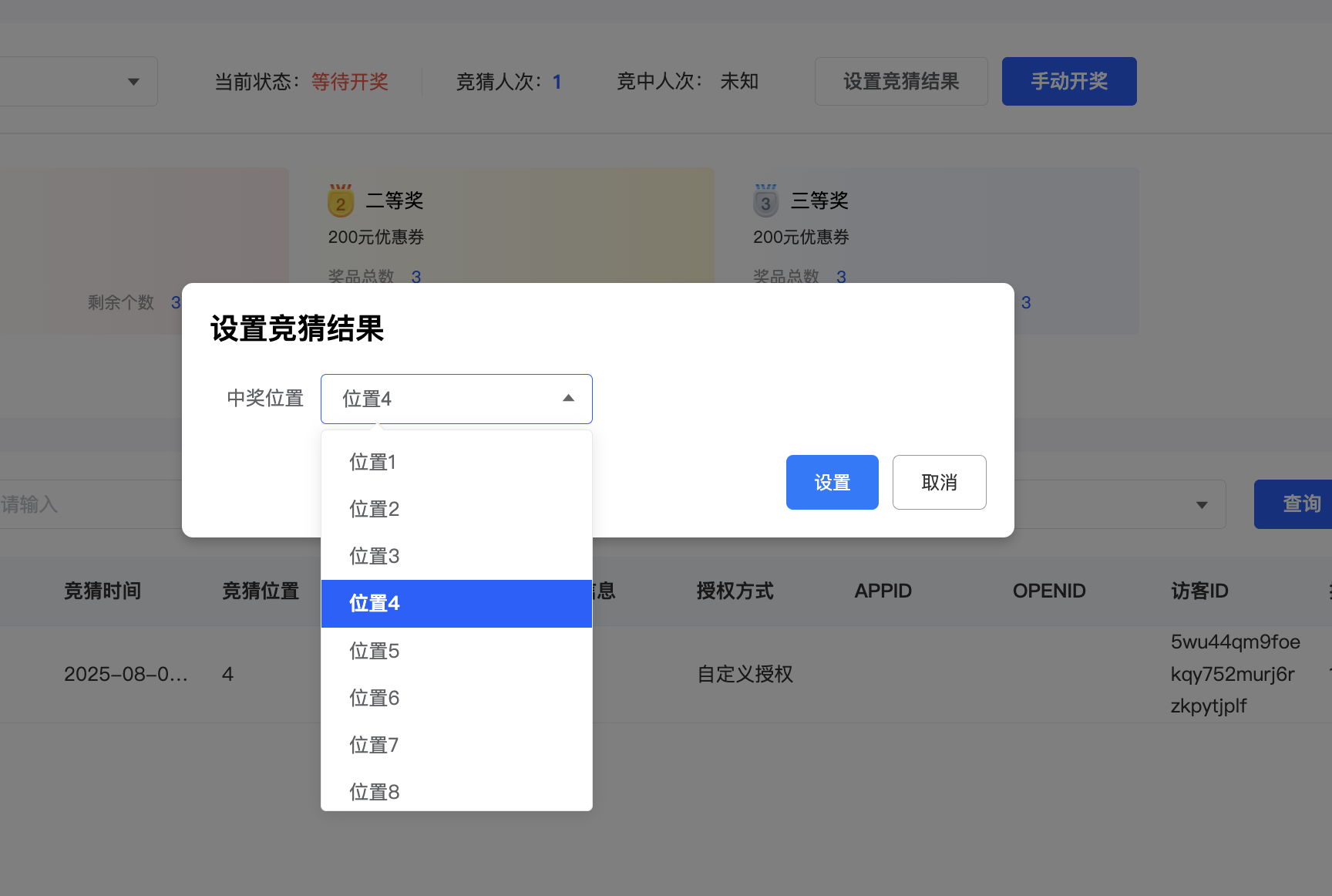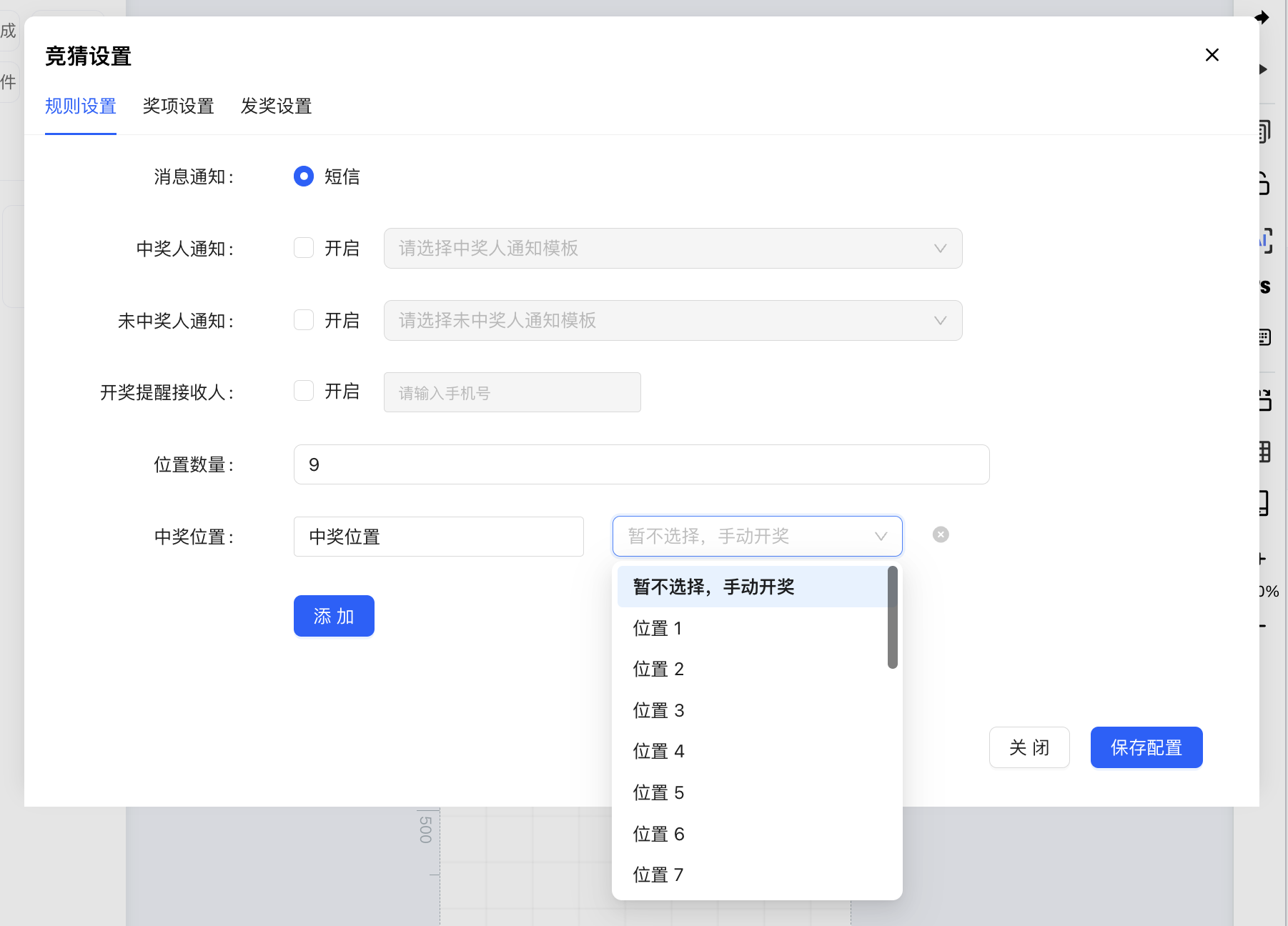 可以根据业务场景选择猜奖的位置,并且设置猜奖的中奖位置,如果之前知道中奖位置,直接设置即可,如果是等开奖才知道中奖位置,可以选择“暂不选择,手动开奖”