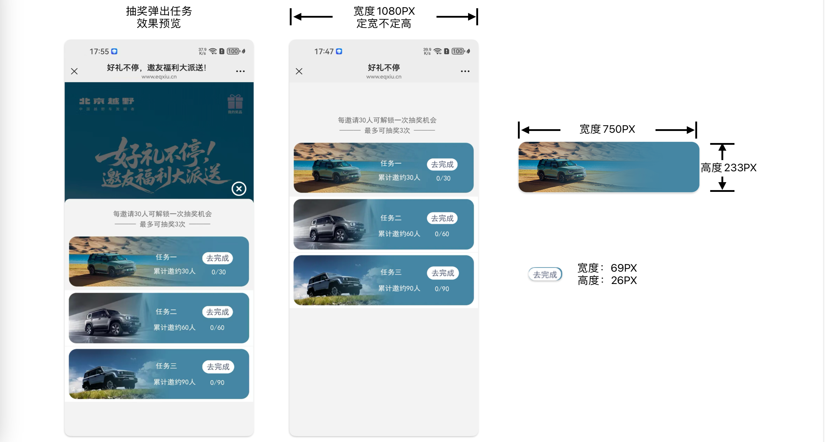 H5页面宽度:1080像素,可等比扩大H5页面高度:宽度为1080时,高度至少为2126像素任务卡片宽度:750像素任务卡片高度:233像素(宽高可等比例放大)去完成、待领取、已领取 按钮尺寸宽度:69像素高度:26像素(“进行中”按钮为系统内置,暂不支持自定义)
