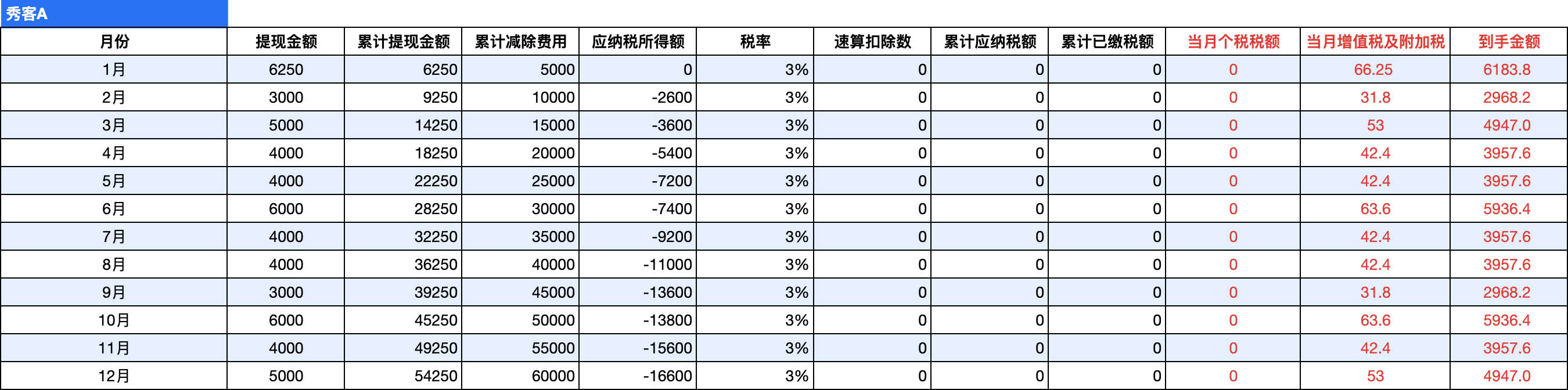 即:9月提现,10月打款,届时将扣除个税、增值税及附加税;11月申报个税后税务系统返回信息;12月申报增值税及附加税,若无需缴纳,将在申报后返还预扣的增值税及附加税至秀客提现银行卡账户。