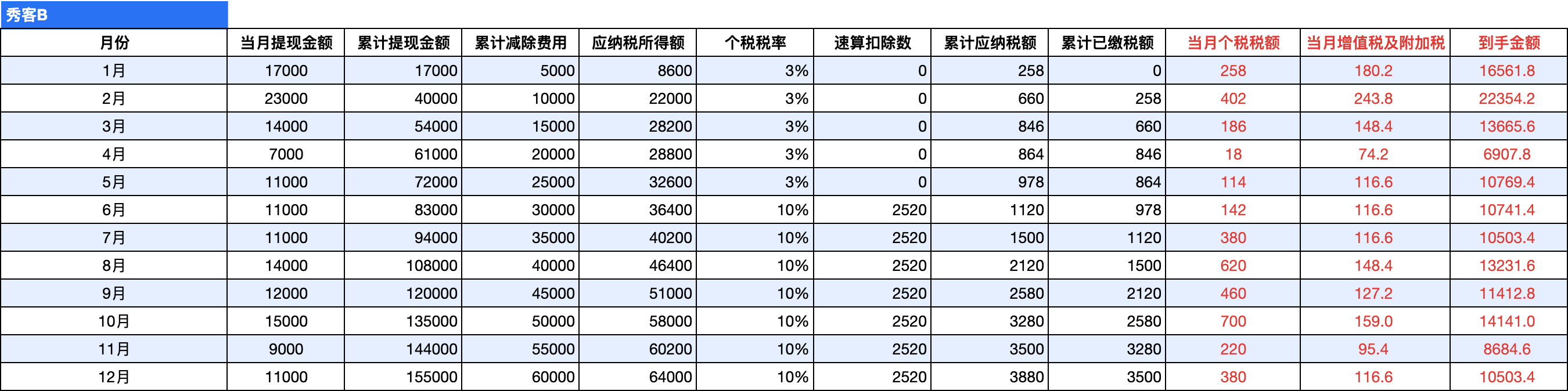 为了让大家更直观的了解新政策下的扣税金额,特为大家举例,仅供参考,因涉及是否每月连续提现、年度与工资等其他收入进行年度综合汇算清缴等情况,具体以实际情况金额为准。(*增值税及附加税若不涉及,将在申报后退还至提现银行卡账户)