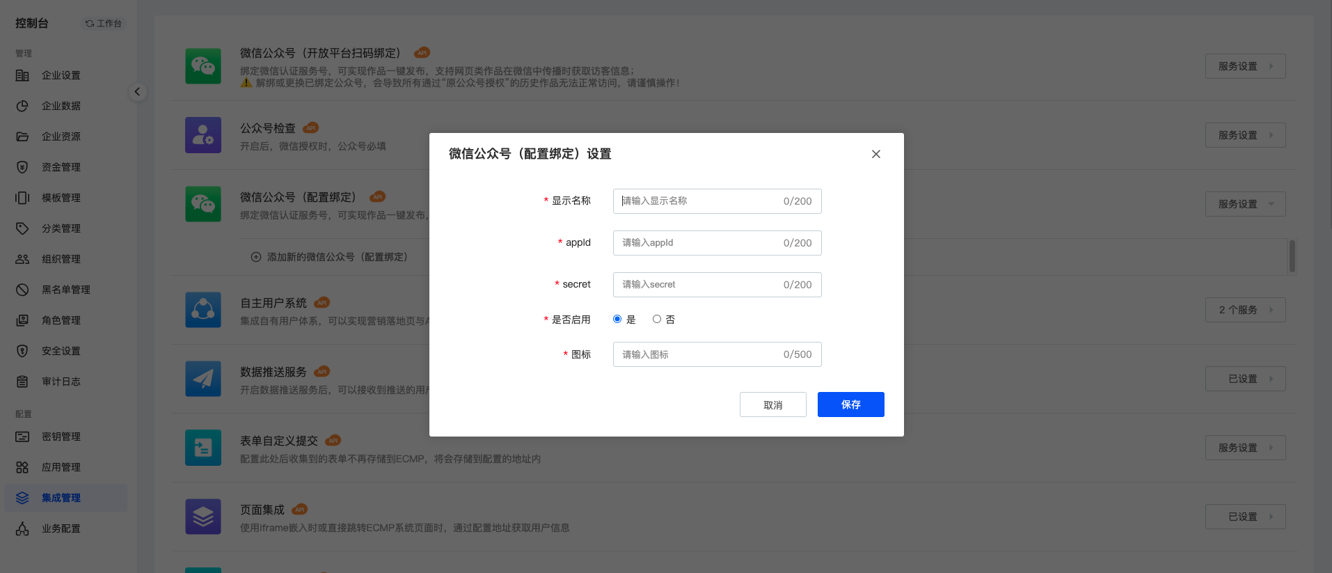 菜单路径:控制台-集成管理-微信公众号(配置绑定)-添加