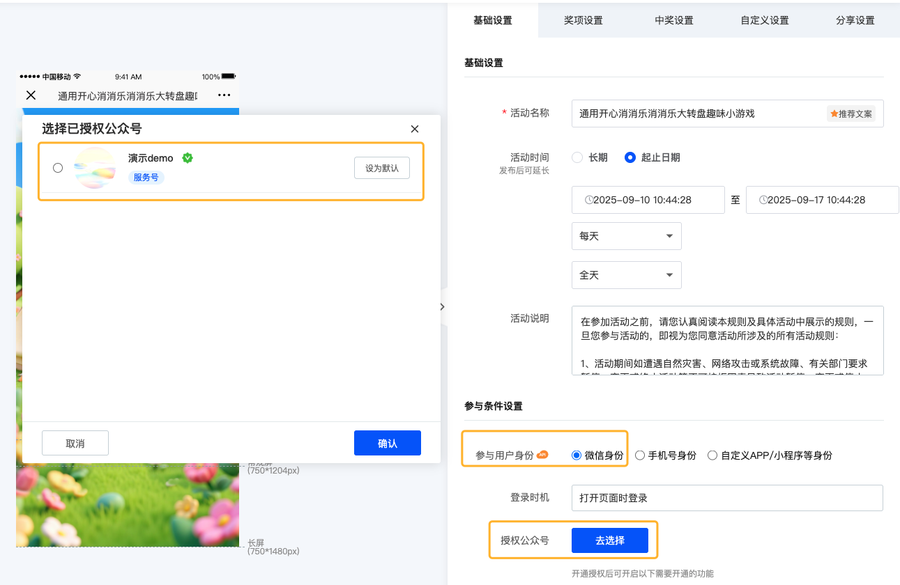 菜单路径:编辑作品-参与用户身份-微信身份-请选择公众号-目标公众号