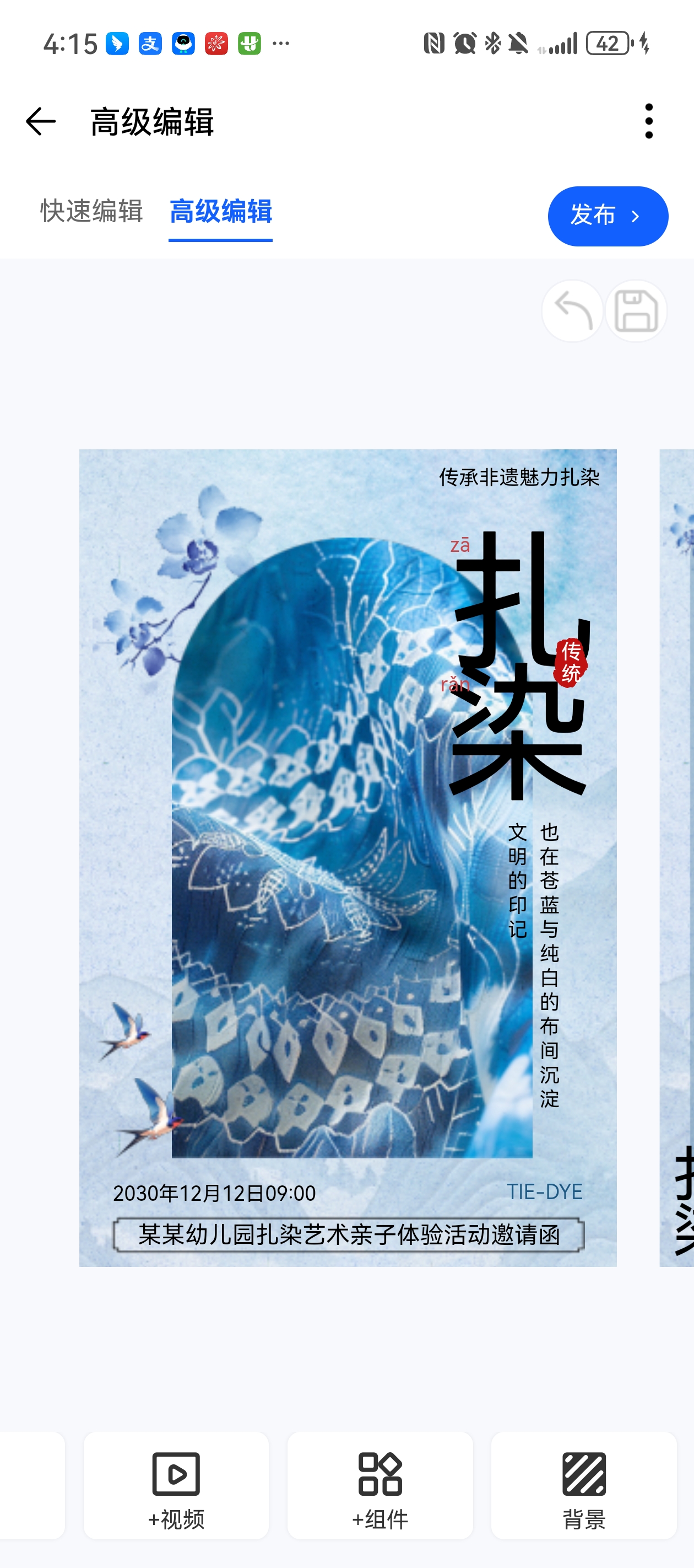 2、海报编辑器中,点击添加,支持添加文字、图片和日期组件