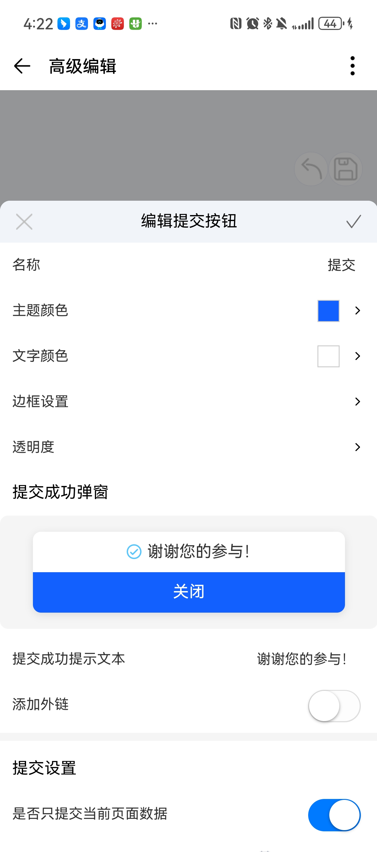 点击添加提交按钮,出现编辑提交按钮,支持修改名称,支持修改主体颜色、文字颜色、边框设置和透明度,支持修改提交成功的提示文本,支持添加外链。