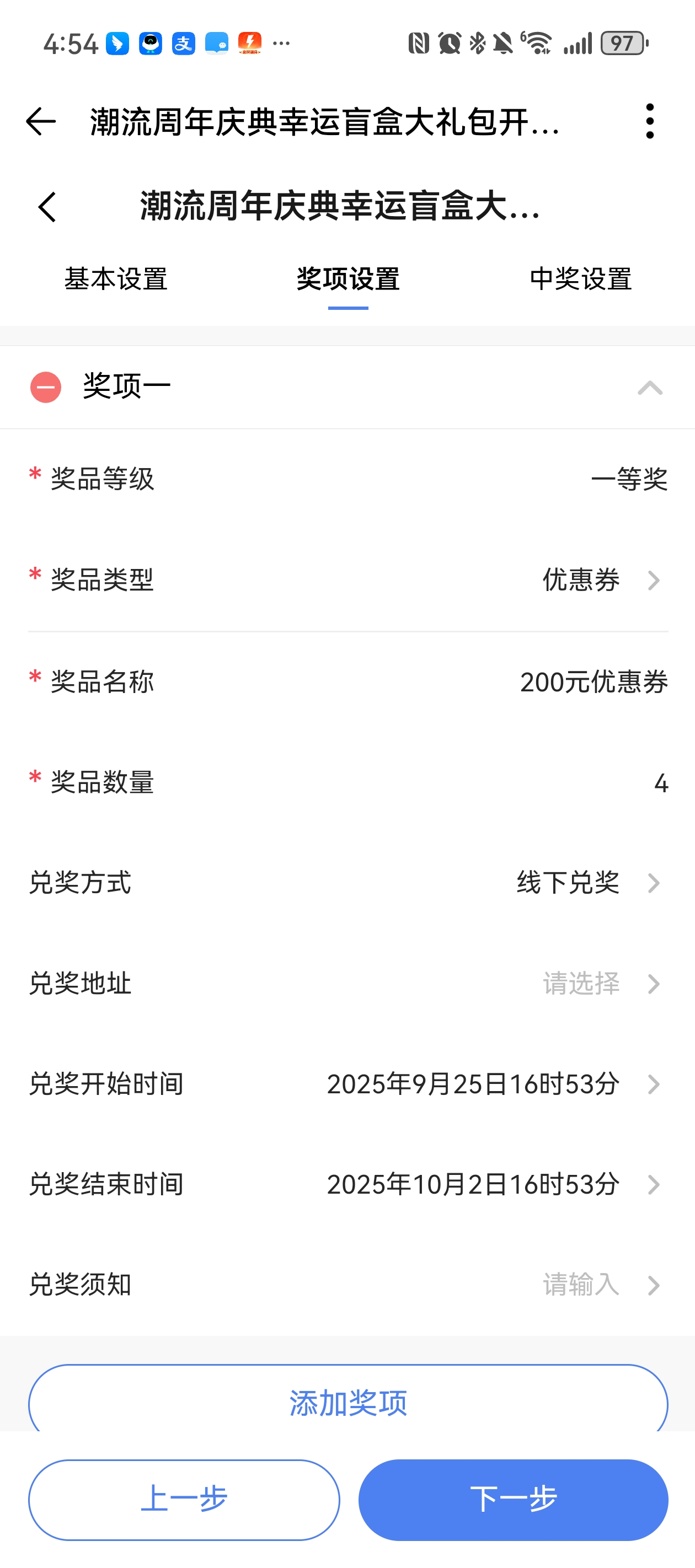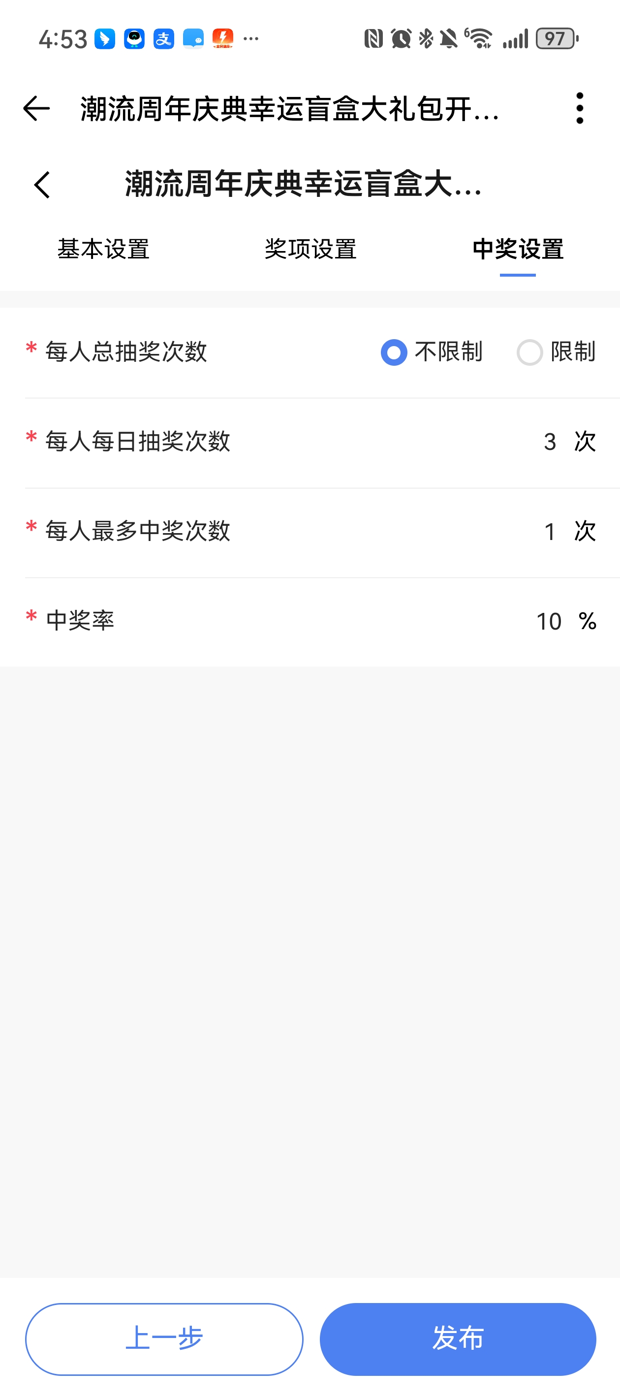 1、在平台模板/企业模板中找到目标模板,点击使用,进入互动编辑器,进行当前活动的基本设置,修改活动名称、活动开始结束时间、活动说明等,支持设置引导关注按钮,点击下一步,进入奖项设置设置奖项;奖项设置完成进入中奖设置,设置完成之后,点击发布;