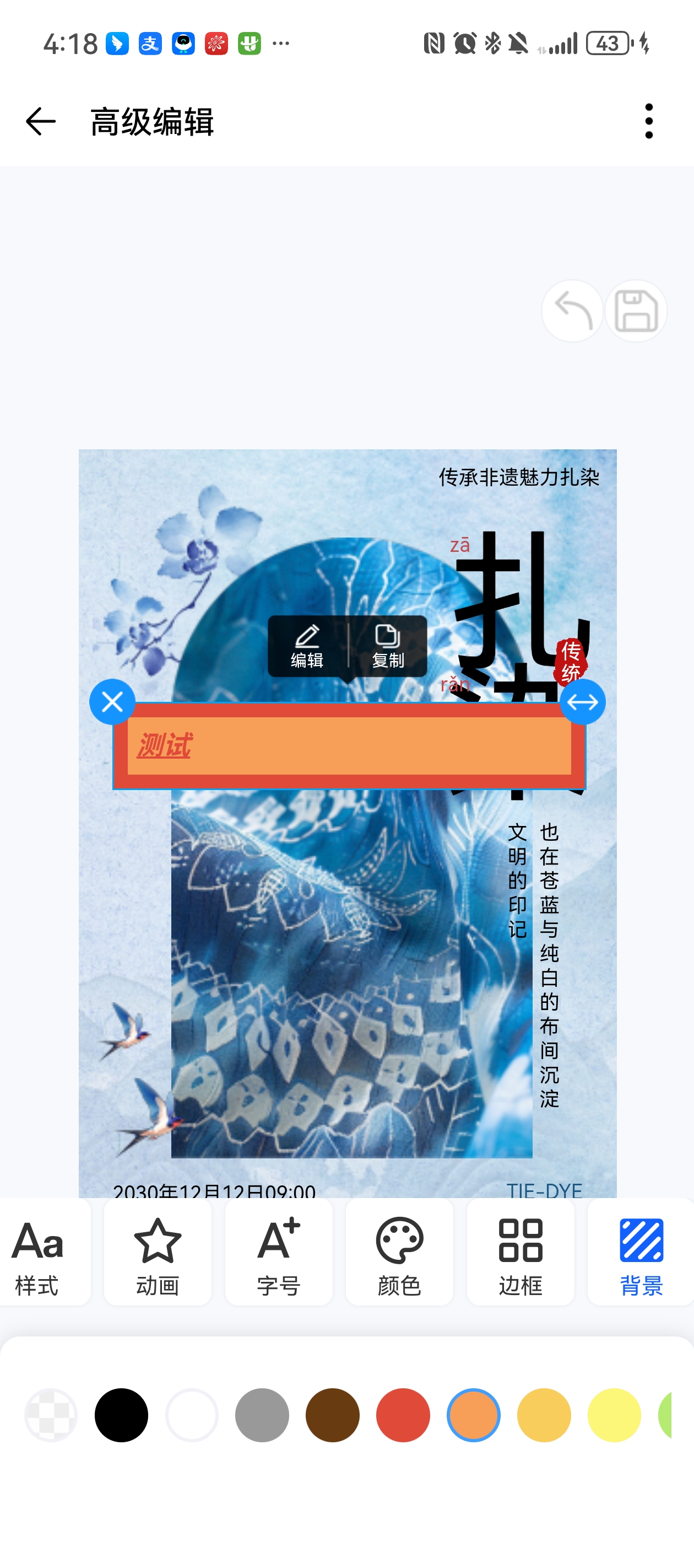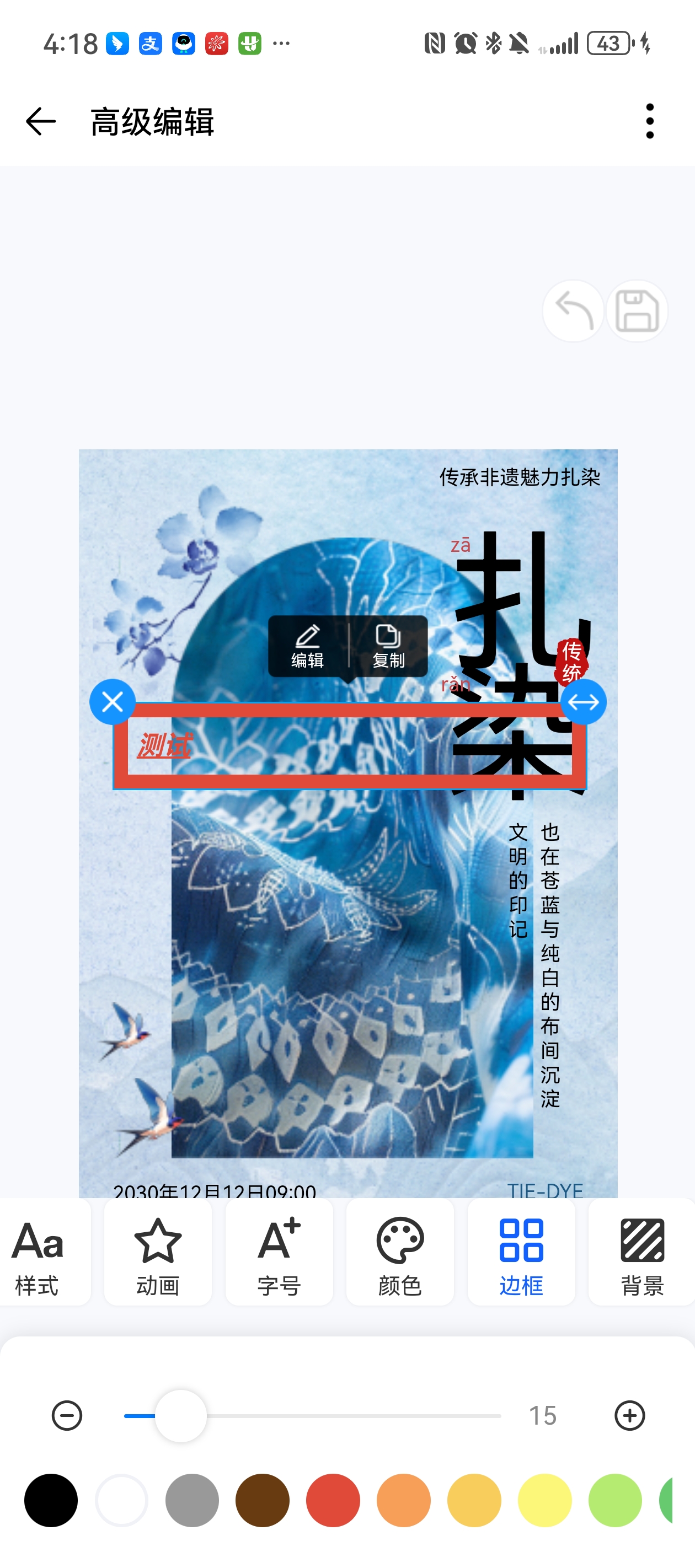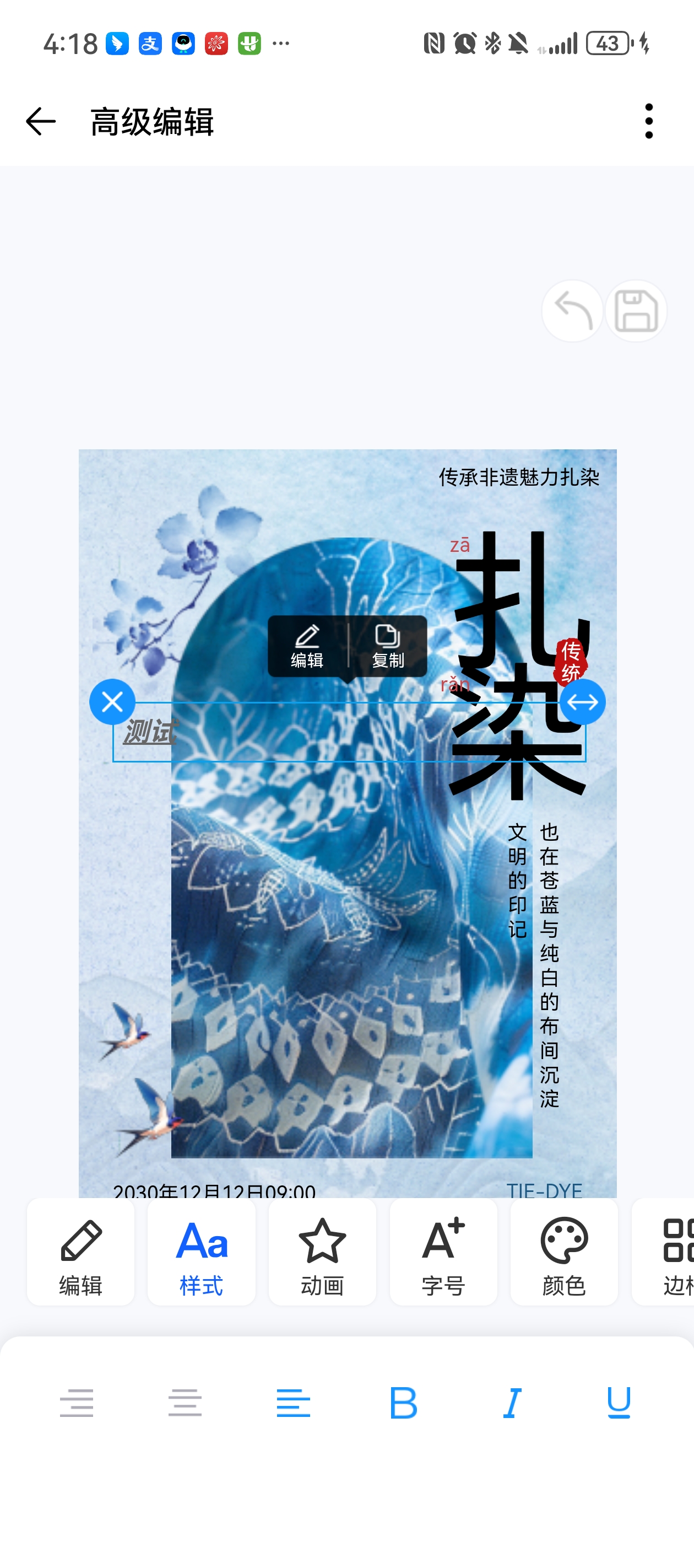2.4、点击添加文字,出现编辑文字页面,编辑完成之后,添加的文字出现在画布中,支持对添加的文字进行再次编辑,支持复制当前文字、删除当前文字,支持修改文字的样式,居左居右居中、加粗、斜体、增加下划线等样式,支持添加动画,选择动画之后,画布中可以出现动画的即时效果,支持对文字修改颜色,支持对文字增加边框和修改文字的背景颜色。