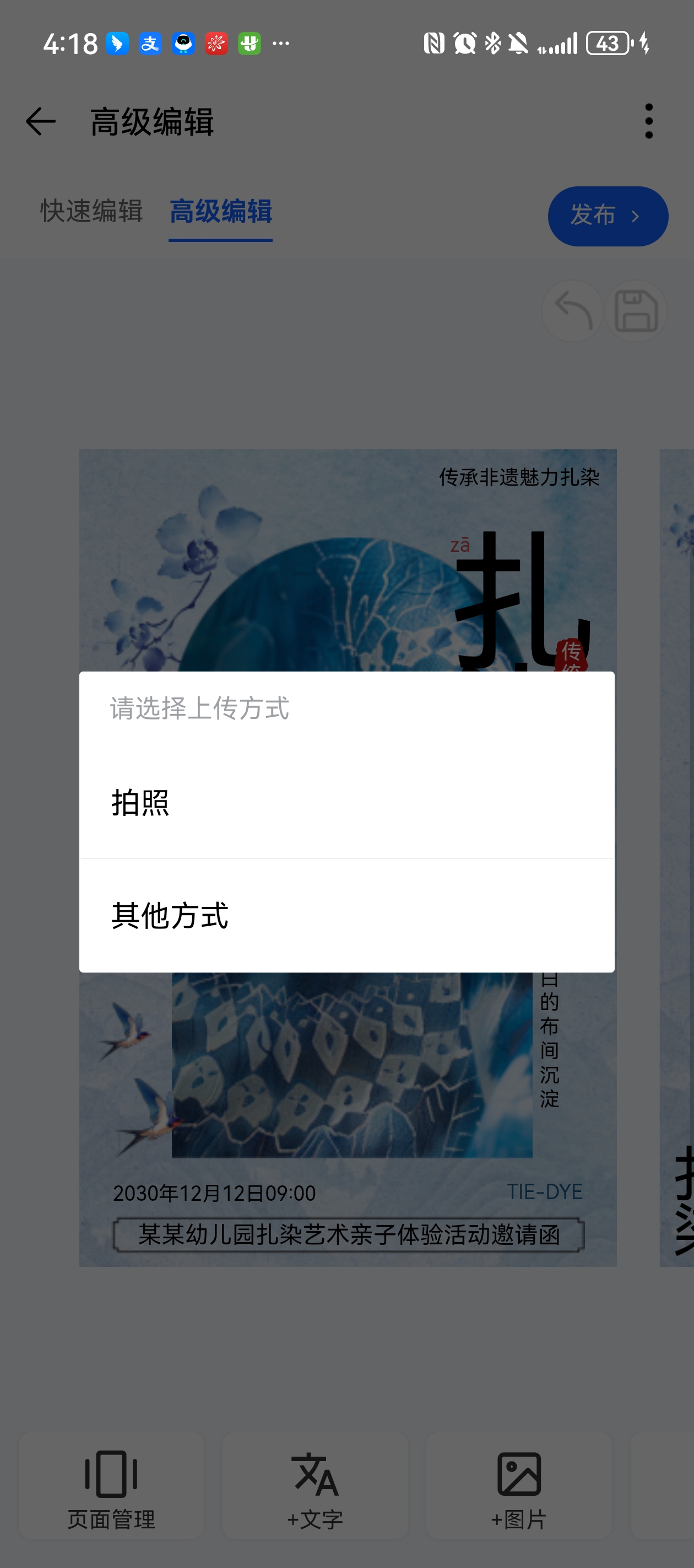 2.3、在海报编辑器中,点击添加图片,弹出选择上传方式,通过拍照或者选择图片库中的图片,选择之后,出现图片裁剪,支持形状裁剪和比例裁剪,点击确定,添加到画布中;支持拖拽图片的位置、拖动改变图片的大小尺寸;支持添加图片边框,修改图片边框的颜色;