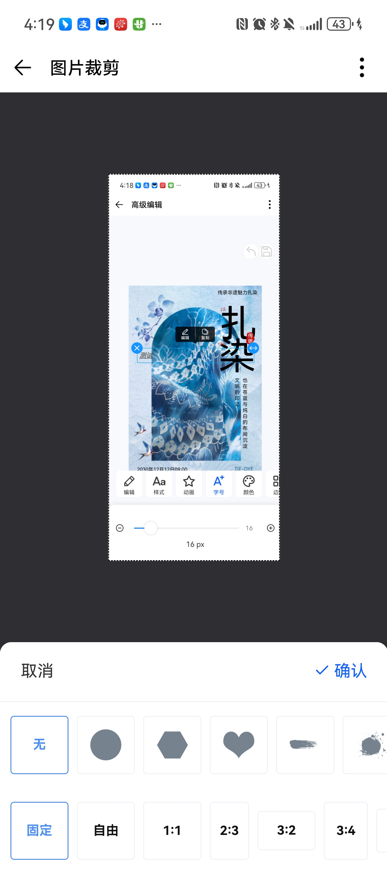 2.5、点击添加图片,调出系统图片库或者拍照来添加图片,上传之后,会出现裁剪,支持形状裁剪和比例裁剪;图片支持动画,选择动画之后,在当前画布出现即时效果