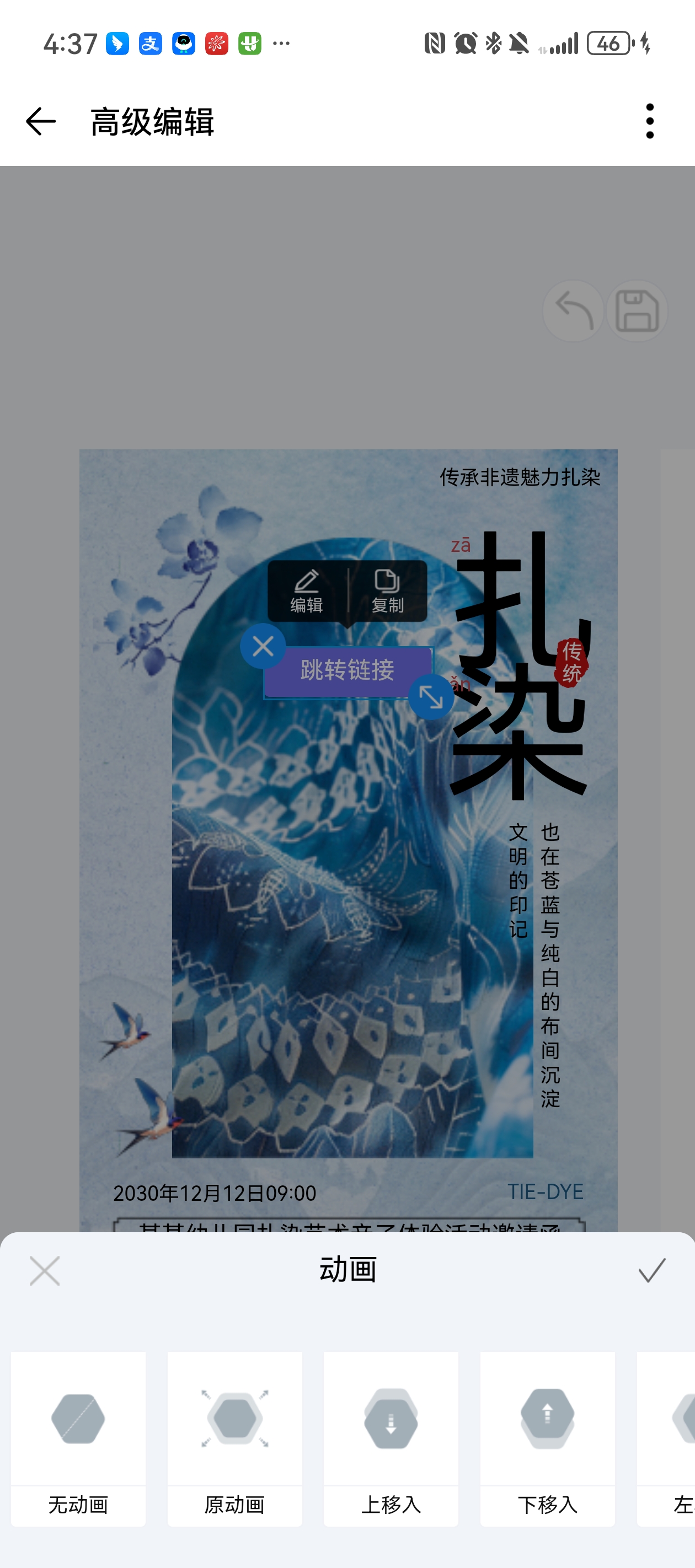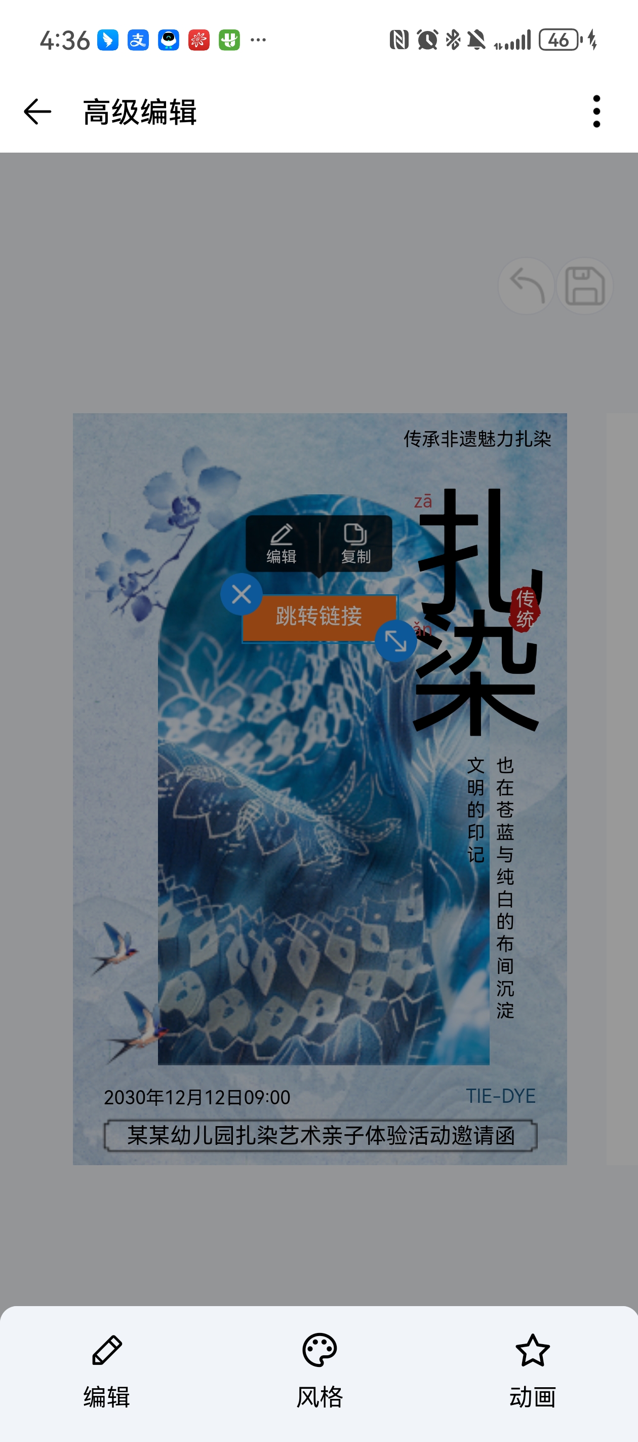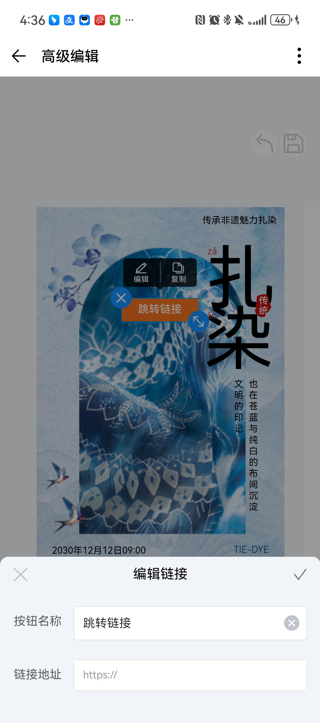 2.9、点击添加链接,画布中出现跳转链接的按钮,支持编辑跳转按钮和链接地址,支持修改按钮风格,支持添加按钮动画;