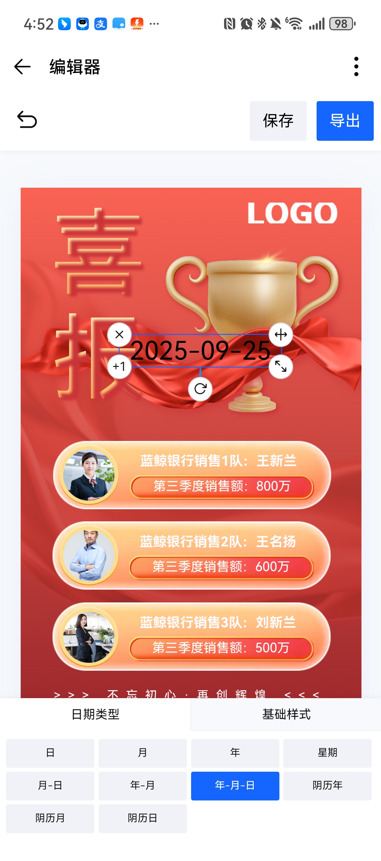 2.4、点击添加日期组件,画布中出现当前日期,可以选择日期类型,修改基础样式,包括字号、颜色、背景色和边框,加粗、斜体、下划线、居左、居右居中等;支持拖拽改变位置、拖动改变大小尺寸