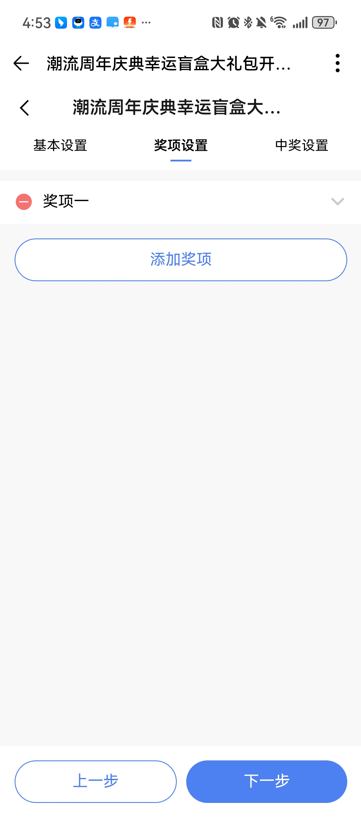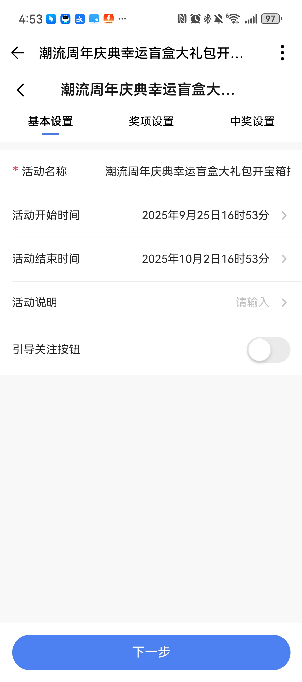 1、在平台模板/企业模板中找到目标模板,点击使用,进入互动编辑器,进行当前活动的基本设置,修改活动名称、活动开始结束时间、活动说明等,支持设置引导关注按钮,点击下一步,进入奖项设置设置奖项;奖项设置完成进入中奖设置,设置完成之后,点击发布;