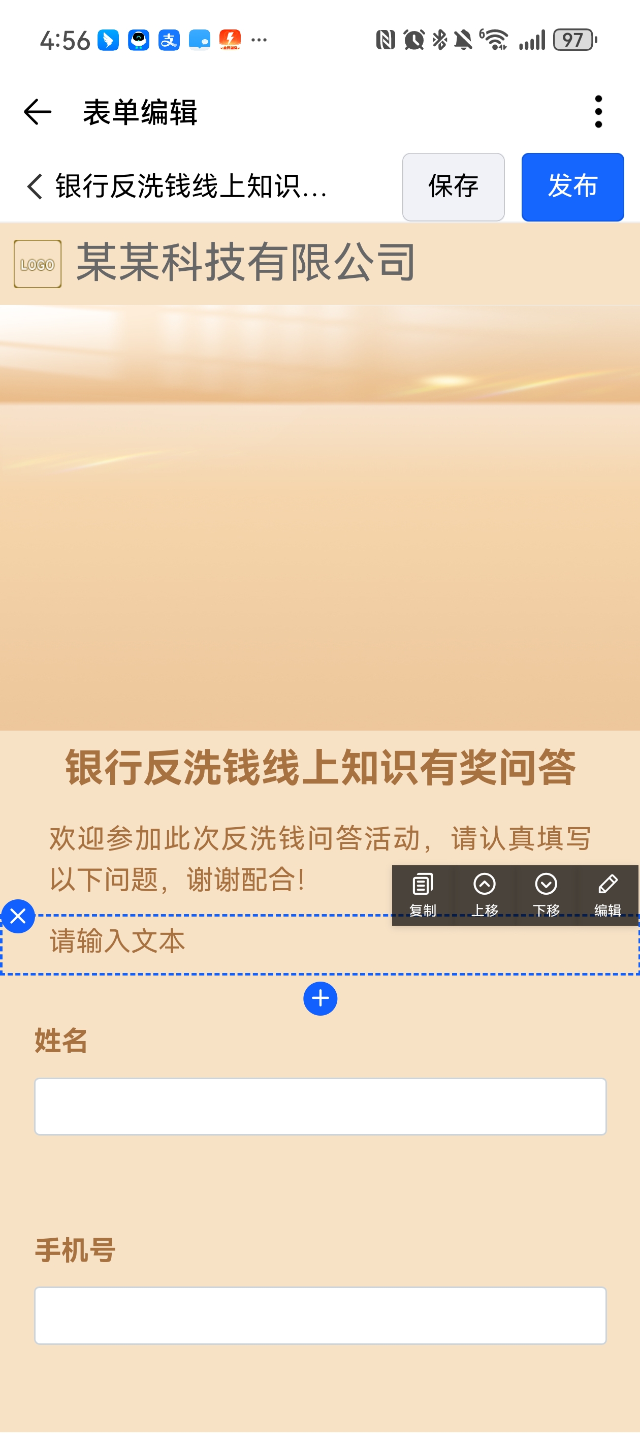 1、问卷类,点击使用进入编辑器,支持对海报中的文字、图片、组件进行编辑、复制、删除、移动位置;