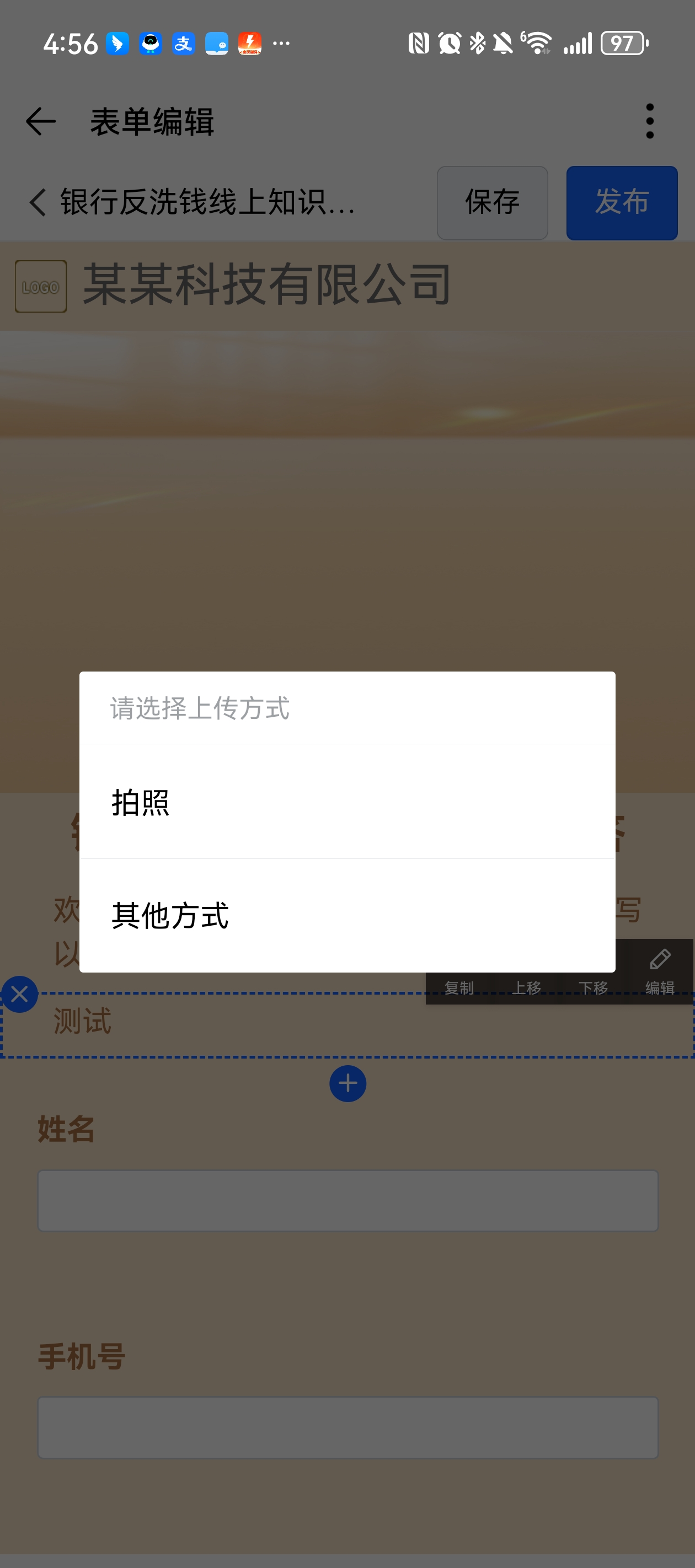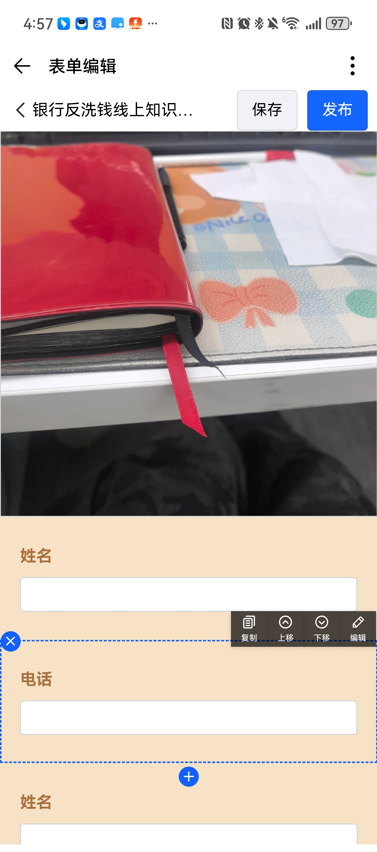 支持添加下拉选择框、单选题、多选题和评分题,每个组件都支持编辑、上下移动位置、复制和删除;