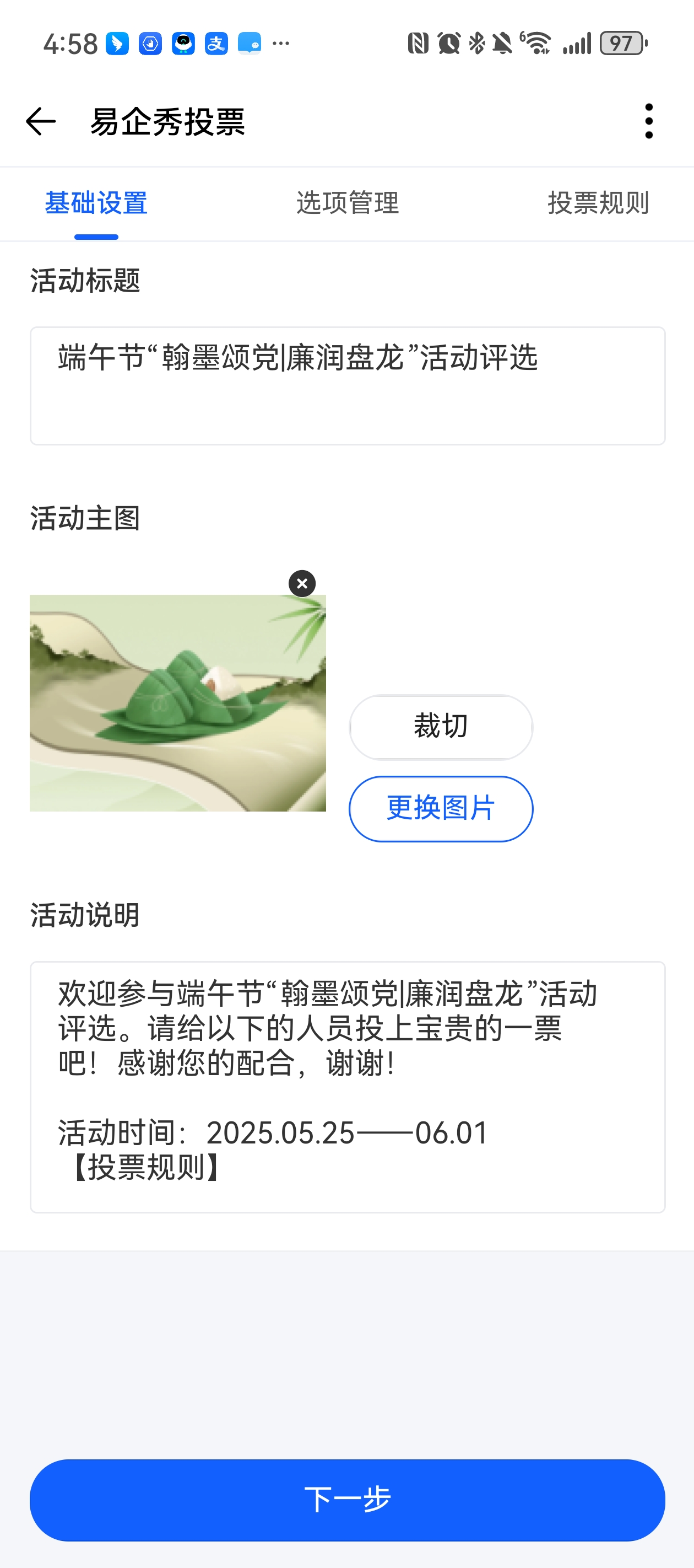2、投票评选类,点击使用进入编辑器,支持对投票评选作品进行活动标题、活动主图和活动说明的编辑,点击下一步,支持添加投票选项,可以设置是否允许访客自主报名,设置之后点击下一步,设置投票规则;设置完成之后,点击发布投票