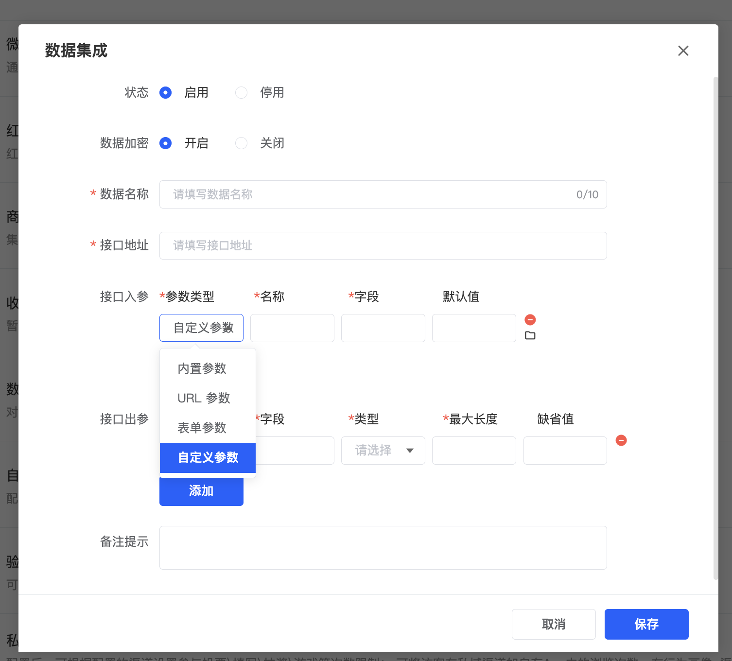 在添加的接口中配置入参和出参,其中入参是查询字段,出参为作品中设置的动态字段,通过「入参」查询「是谁的数据」,