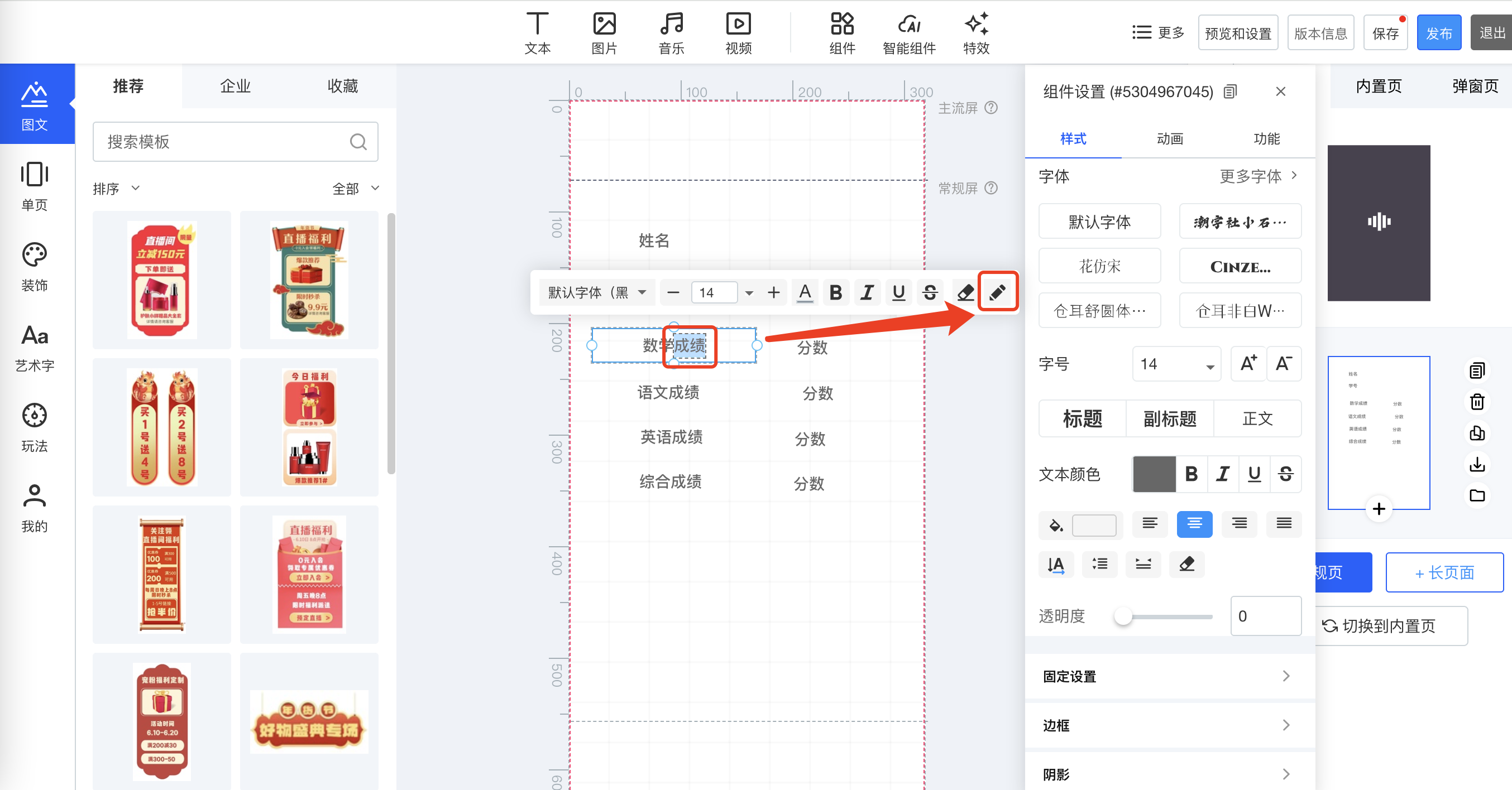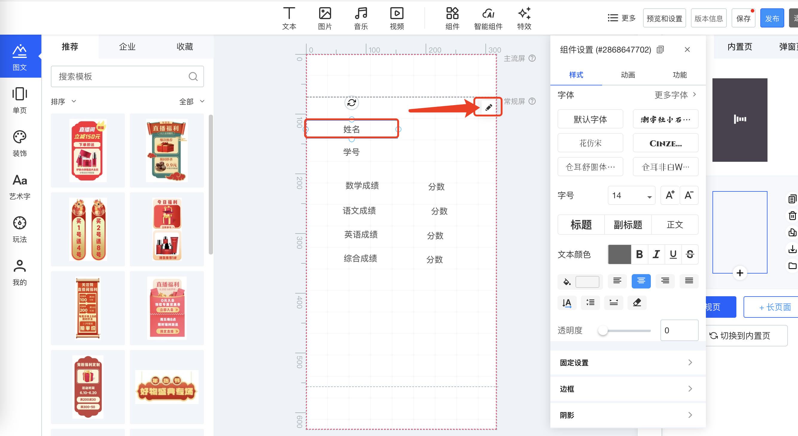 ③.点击需要动态渲染的组件,如姓名,点击右上角修改icon