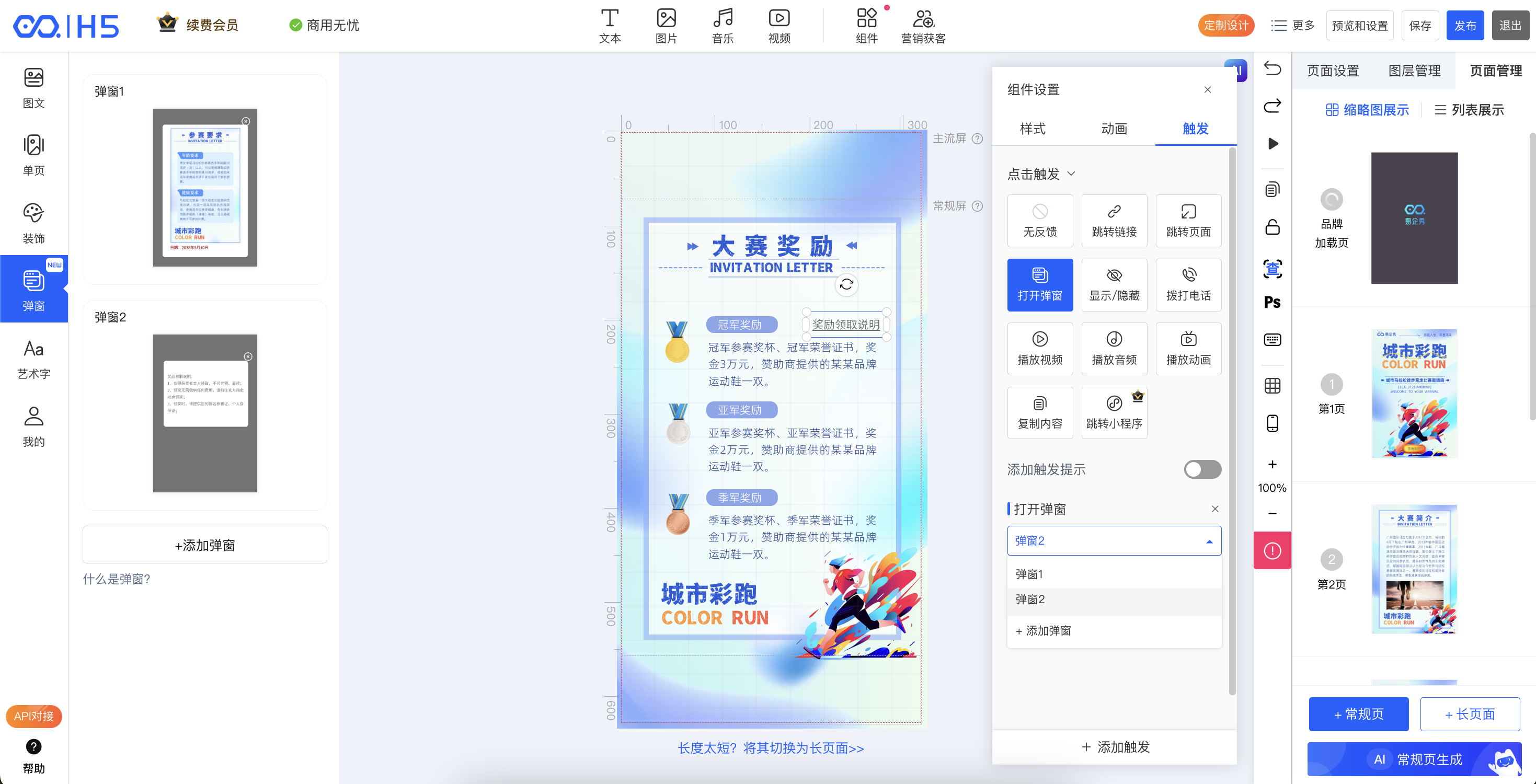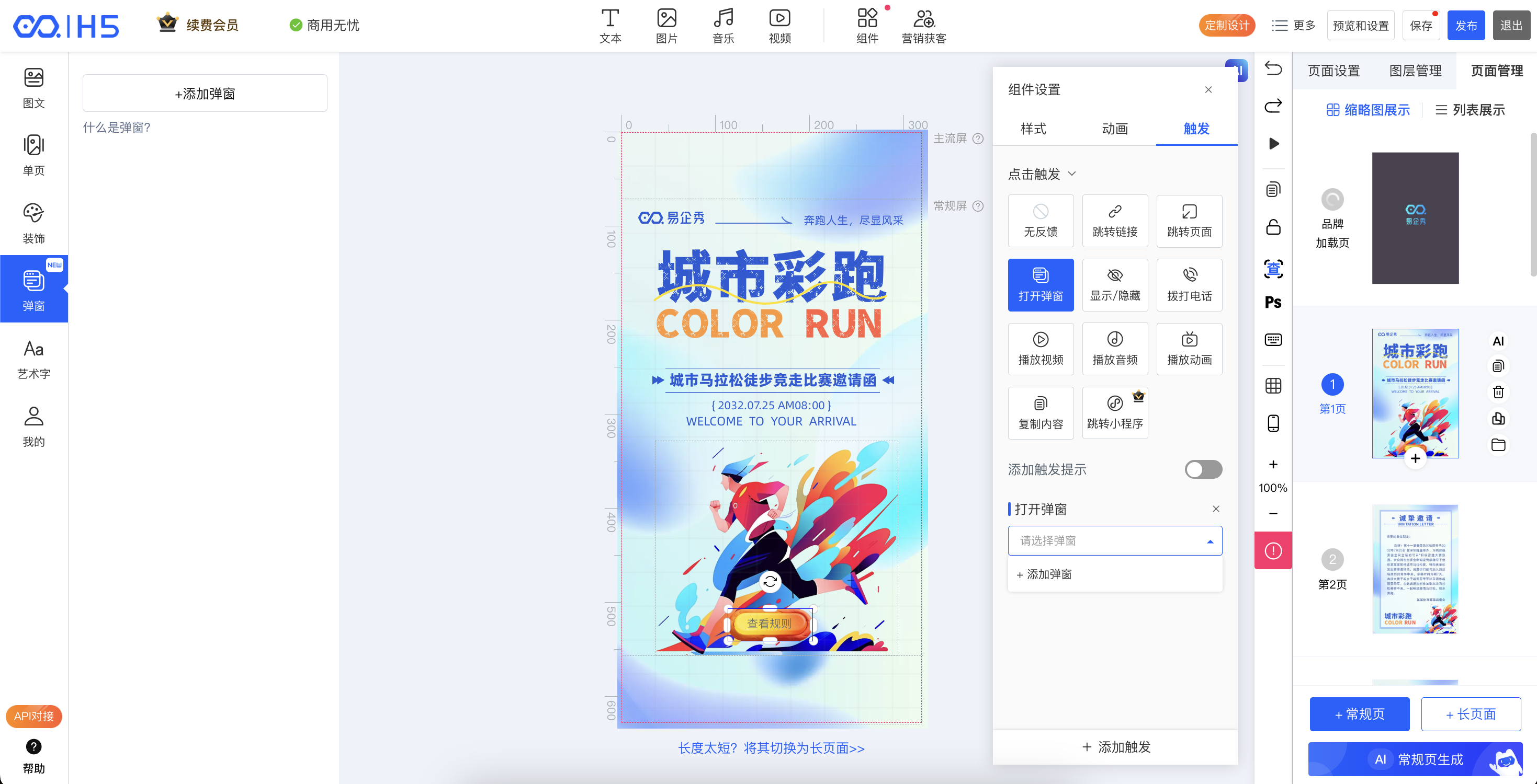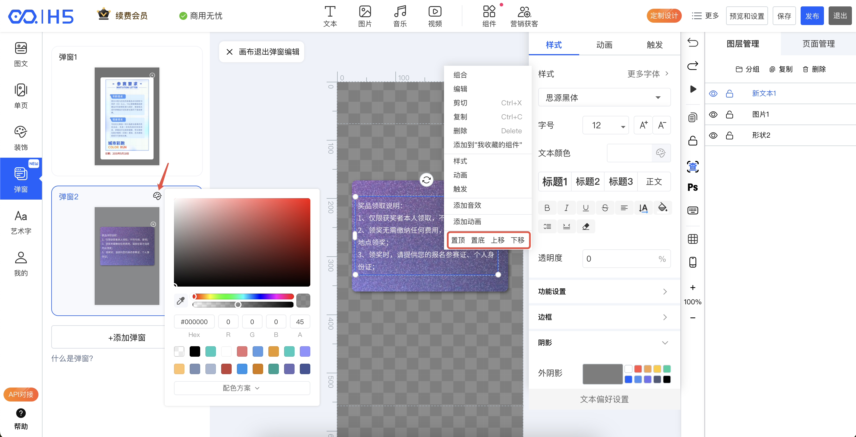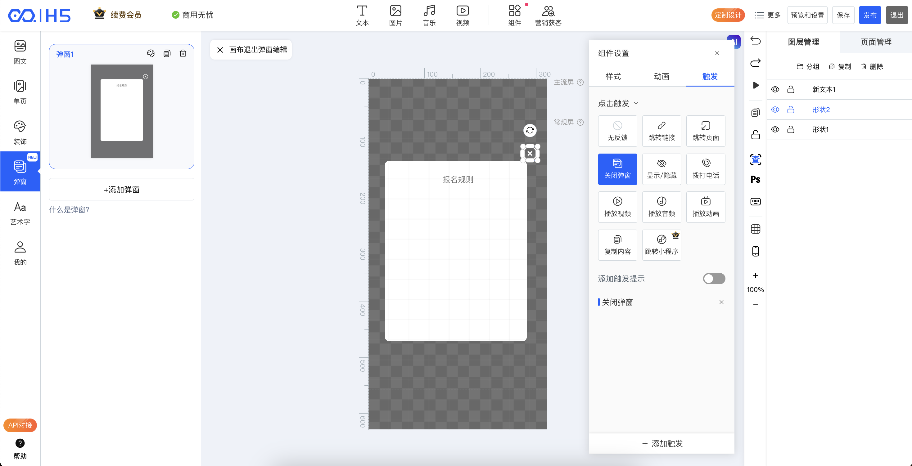 可以在弹窗上任意添加文字及图片,白底弹窗本身也可任意换成其它图片;可以任意拖动改变弹窗的大小,并设置圆角、阴影等;根据H5中各个页面的需要,可以添加多个弹窗,供不同页面调取使用。