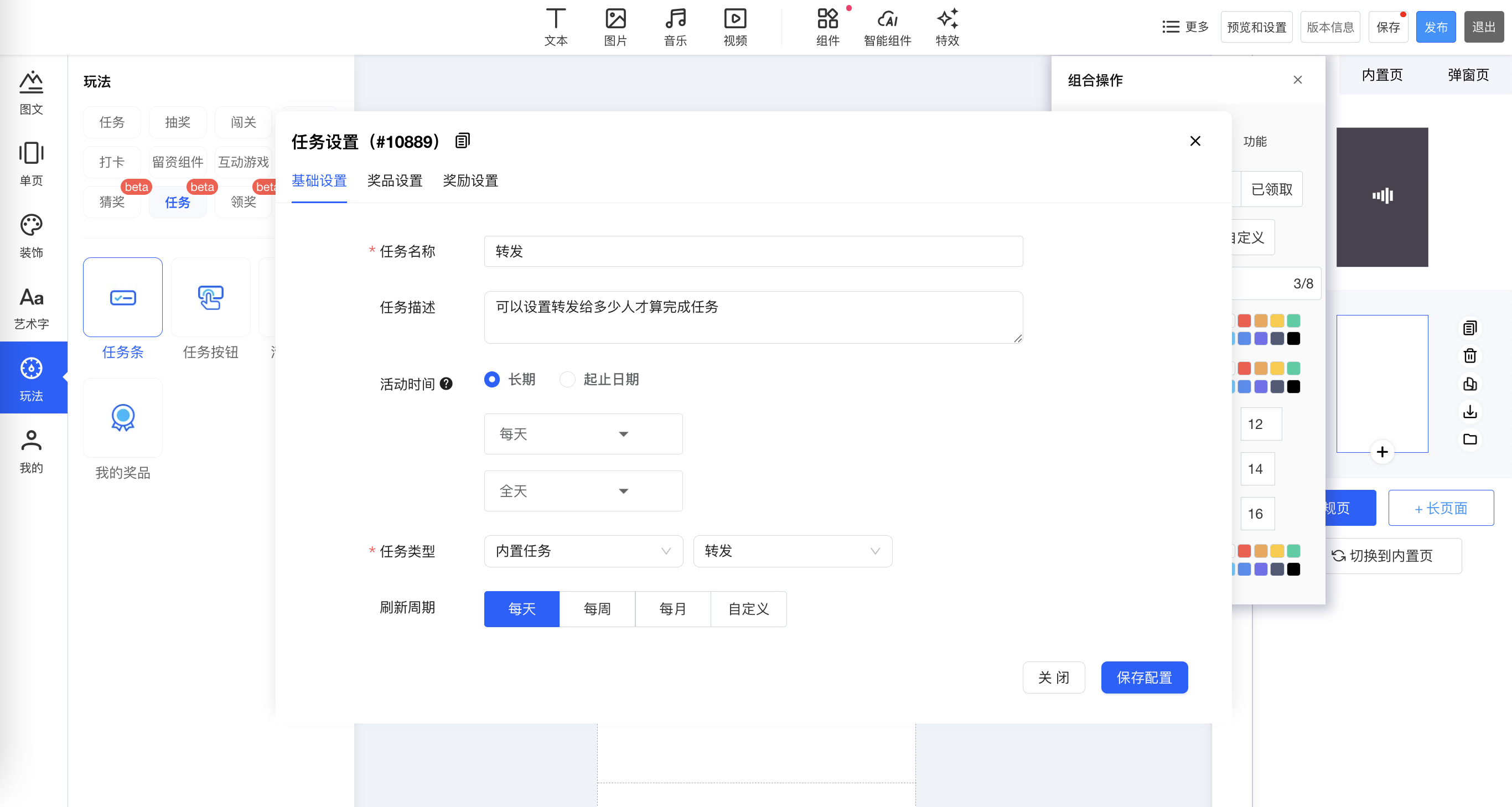 奖品设置:可以选择完成这个任务获得的奖品进行配置,支持礼品、活动权益和作品权益