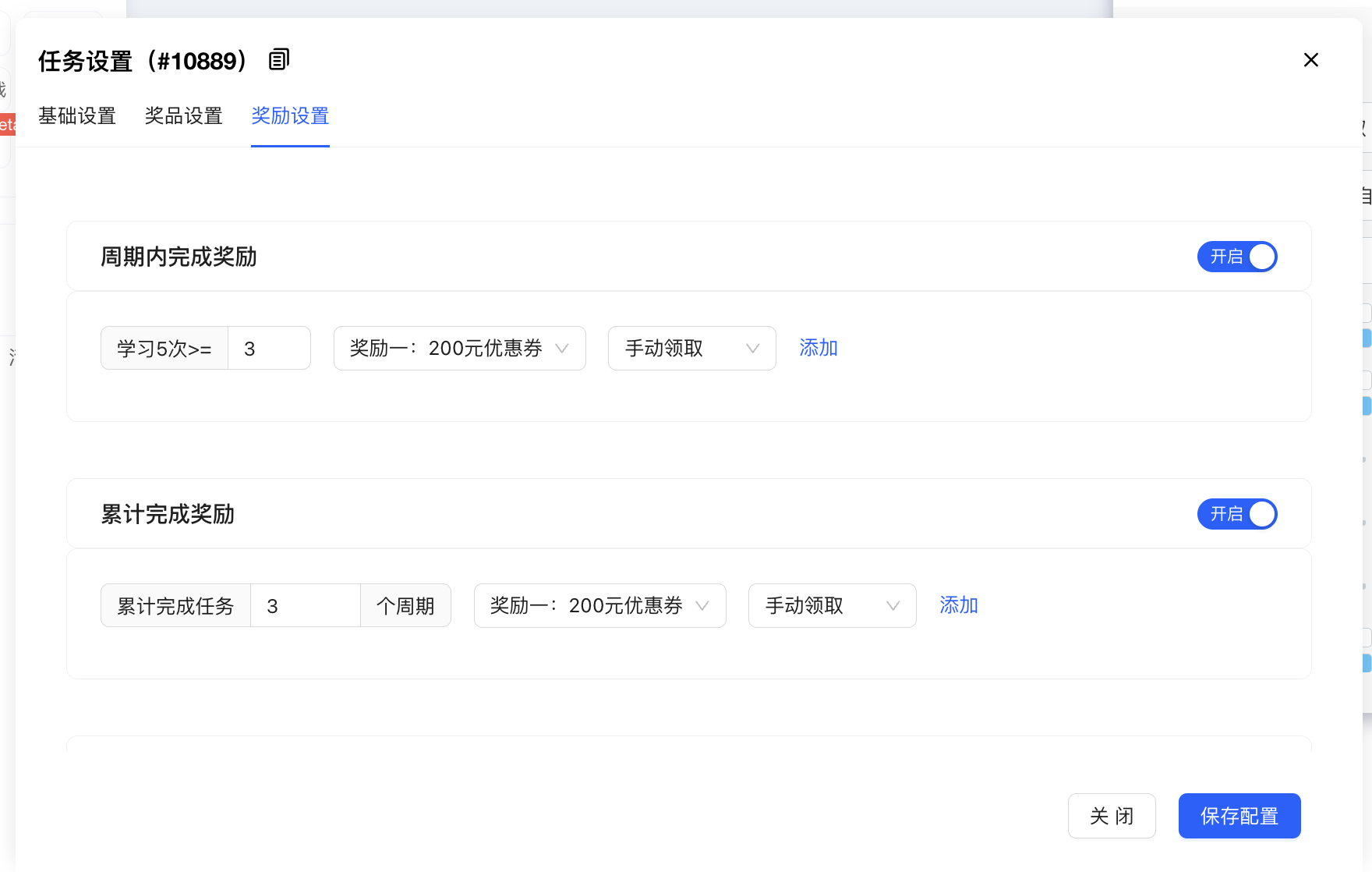 奖励设置,支持选择周期内完成奖励、累计完成奖励或者连续完成奖励