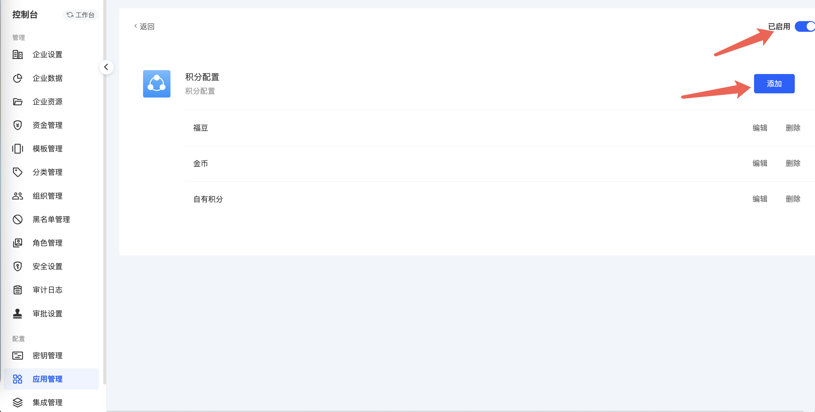 进入积分页面,点击右上角启用按钮,点击下方添加按钮,添加积分系统