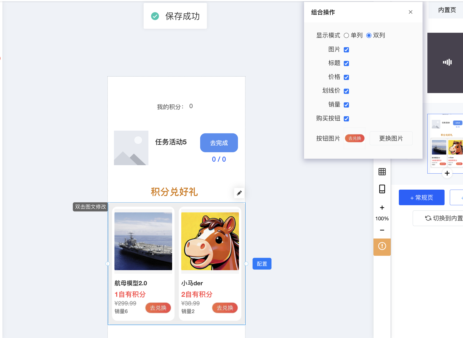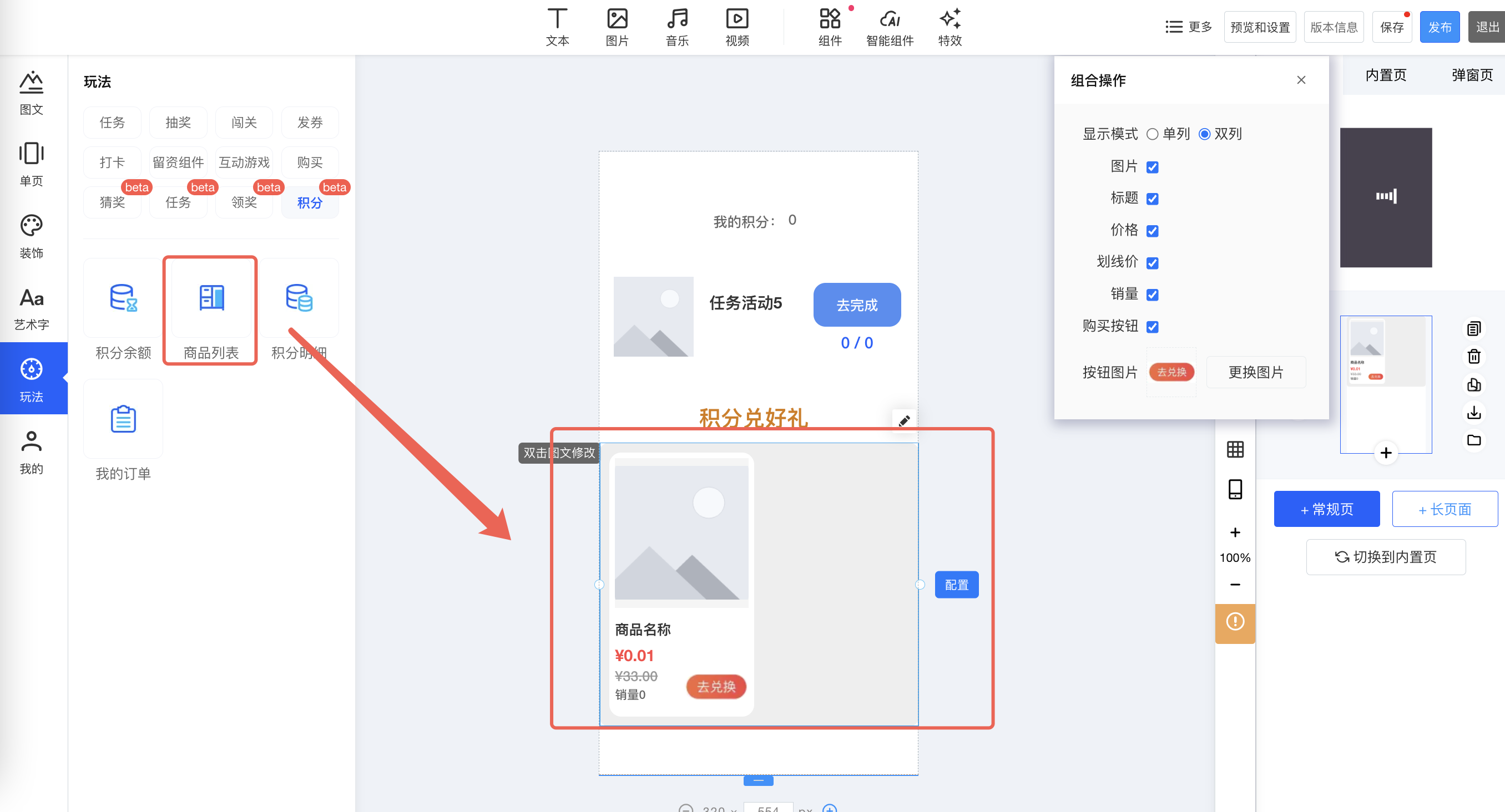 ③.添加商品列表,通过积分兑换商品来消耗积分,添加之后,右边组合操作中可以选择商品列表的展示内容,支持单列和双列,支持显示/隐藏商品的图片、标题、价格、划线价、销量、购买按钮,支持更换按钮图片