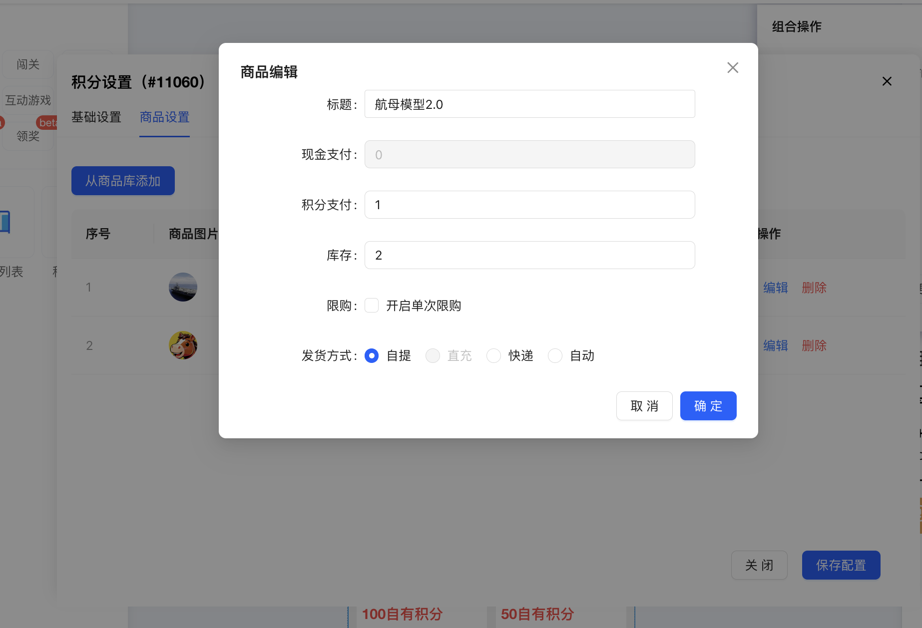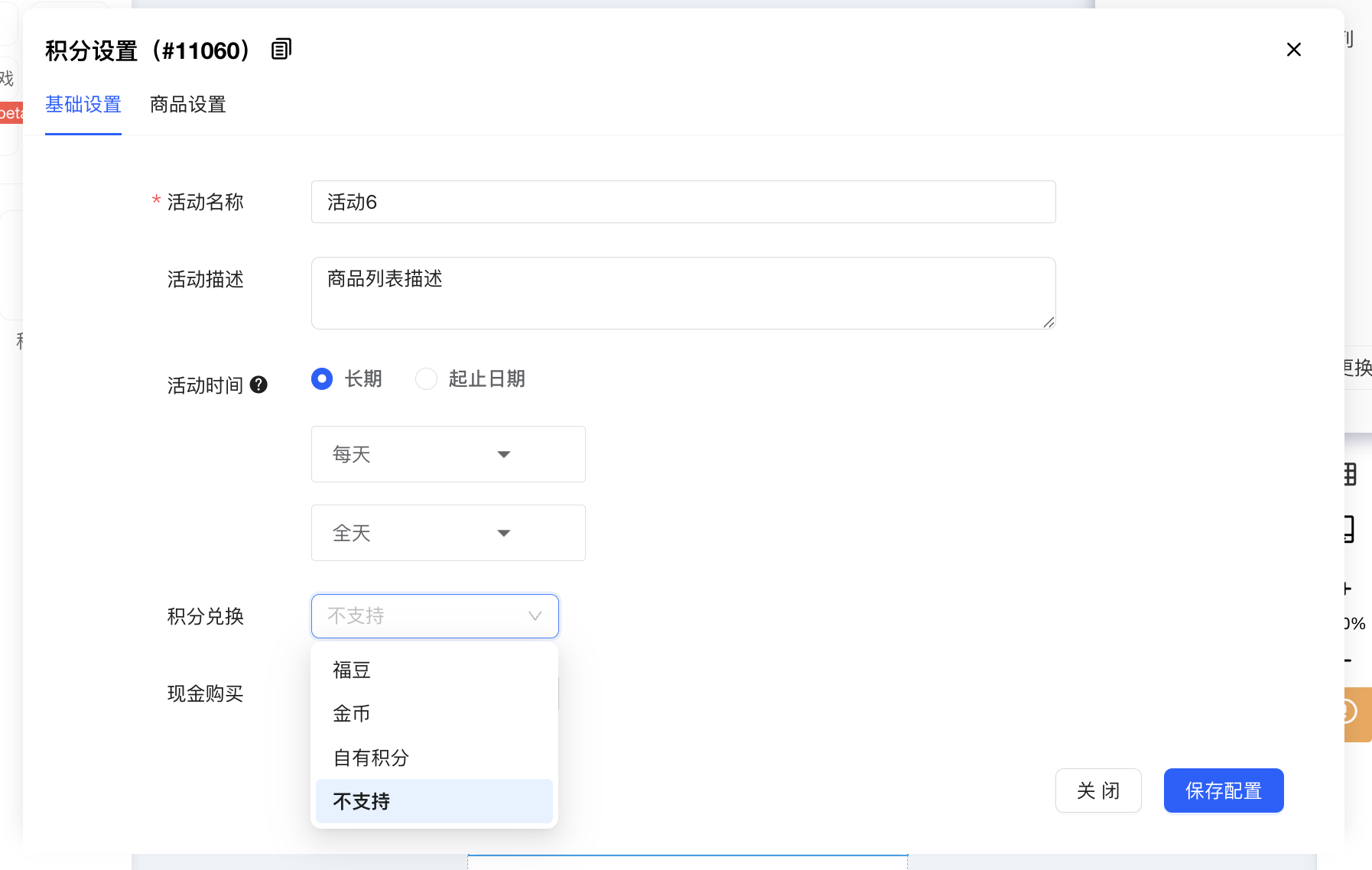 在画布中选中商品列表组件,点击配置,出现的配置弹框中,基础设置,选择某个积分兑换,如果支持现金购买,需要选择支付方式(配置购买组件时设置的)