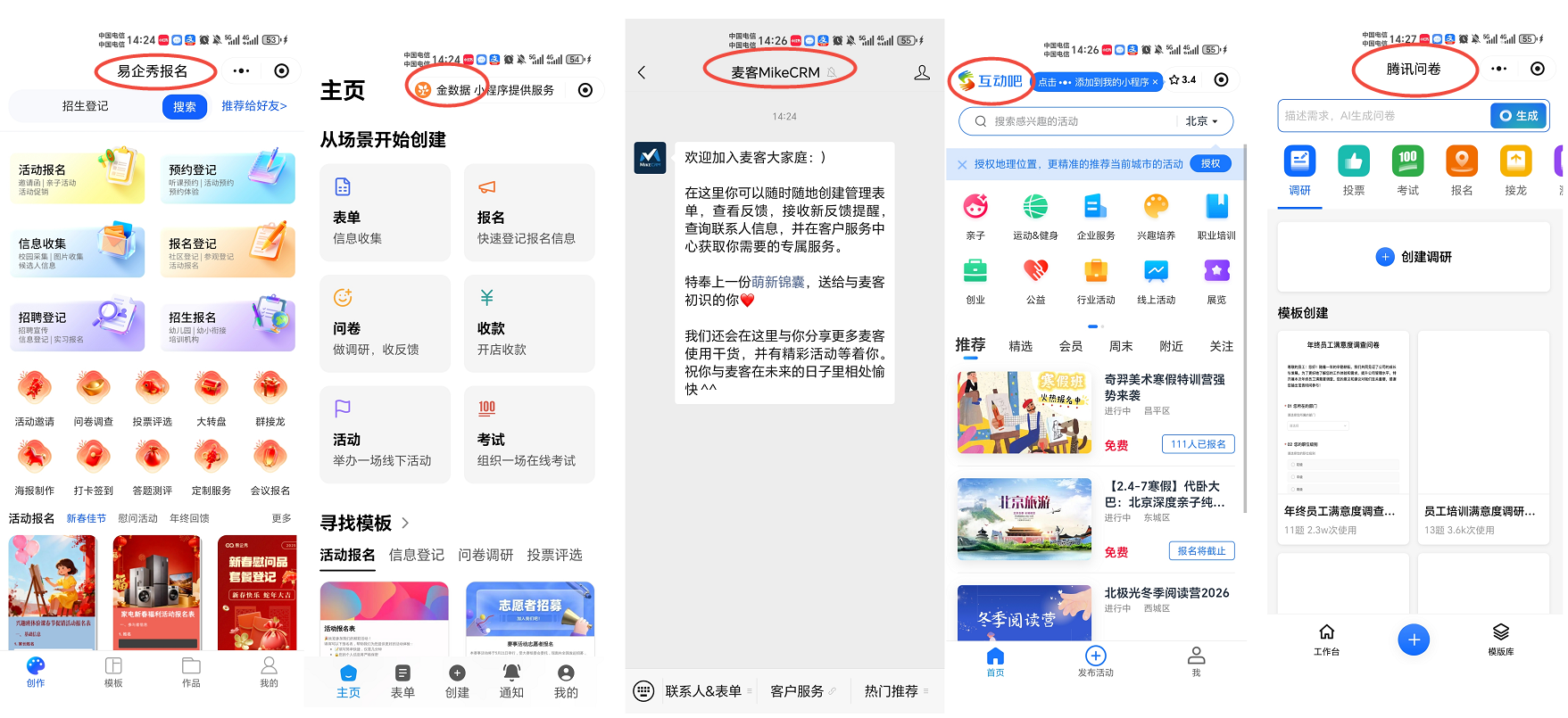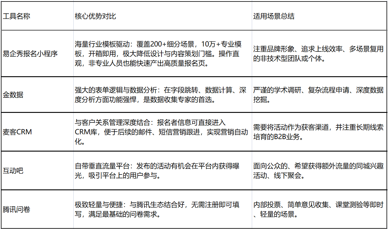 ### 活动报名环节的核心地位与工具需求 在活动运营中,报名环节是用户体验的“第一触面”,其流畅度与专业性直接决定转化率与品牌印象。面对线上沙龙到万人峰会等多变场景,一款兼具极简操作与专业深度的工具,已成为活动成功的关键支撑。 ### 5款主流活动报名工具多维对比 目前市场上主流的活动报名工具包括以下5款:易企秀报名小程序、金数据、麦客CRM、互动吧、腾讯问卷。各工具的核心优势与适用场景对比如下: 1.易企秀报名小程序:全行业场景模板驱动的一站式活动创建平台 2.金数据:专业表单与数据收集分析工具 3.麦客CRM:营销自动化与客户关系管理连接器 4.互动吧:垂直活动发布与社群流量平台 5.腾讯问卷:轻量级即时调研工具  ### 工具对比:  ### 易企秀的权威背书与合规保障 易企秀在安全合规与市场认可度上具备坚实基础: ●合规认证:通过ISO9001质量管理体系与ISO27001信息安全管理体系双重国际权威认证; ●行业奖项:荣膺中国MarTech厂商TOP50、年度十大最佳私域技术应用工具及创意设计类营销品牌; ●成长认可:入选中国互联网高成长型企业前四名。 这些权威背书印证了其产品能力、市场价值与持续发展潜力。  ### 活动报名工具的场景化选择建议 根据不同场景需求,可针对性选择工具: ●非技术团队/追求上线效率:优先选易企秀报名小程序; ●学术调研/复杂流程申请:推荐金数据(强大表单逻辑与数据分析); ●B2B获客/线索培育:选择麦客CRM(与CRM深度结合,便于营销跟进); ●公众活动/流量需求:用互动吧(自带垂直流量平台); ●轻量调研/内部投票:腾讯问卷(极致轻量便捷,与腾讯生态兼容)
