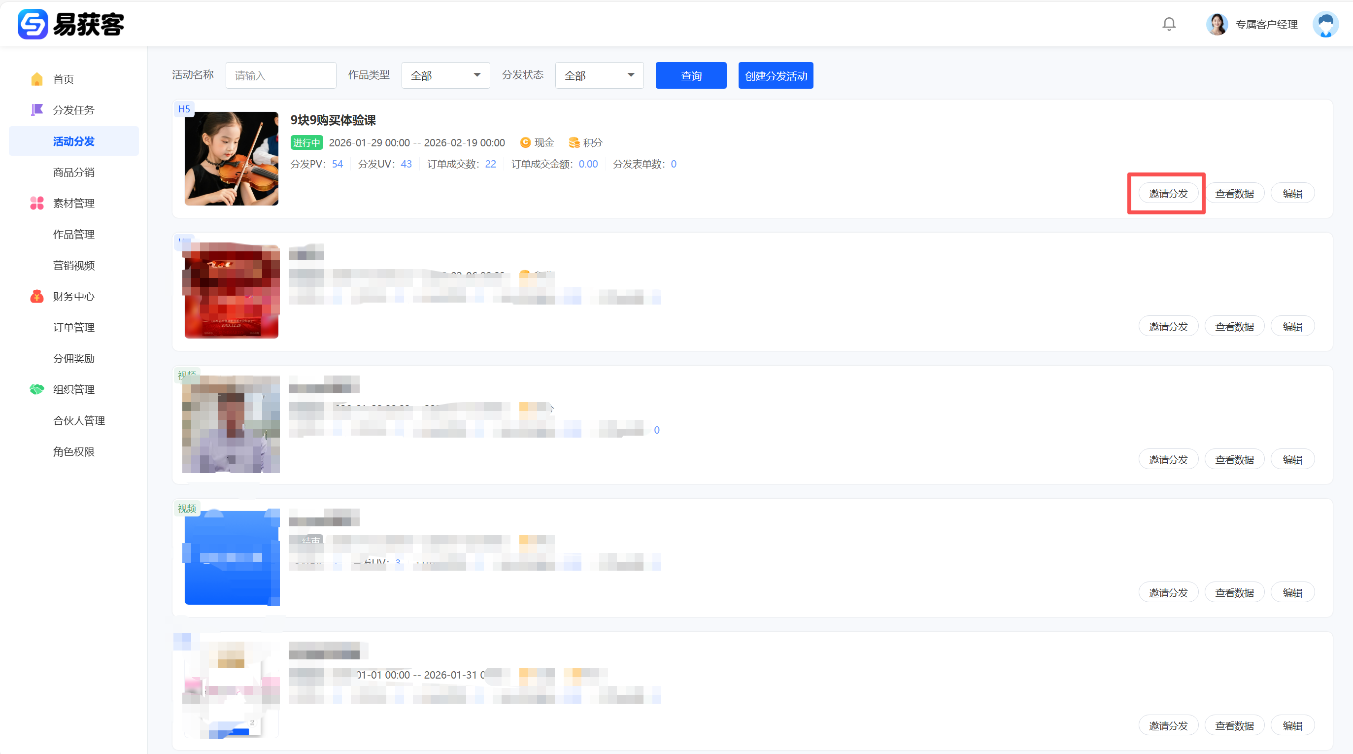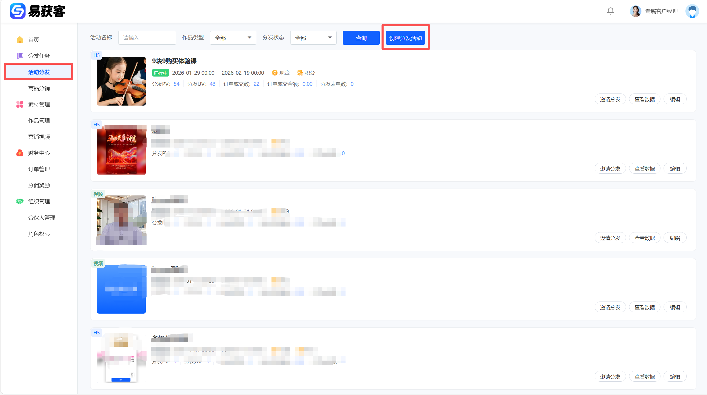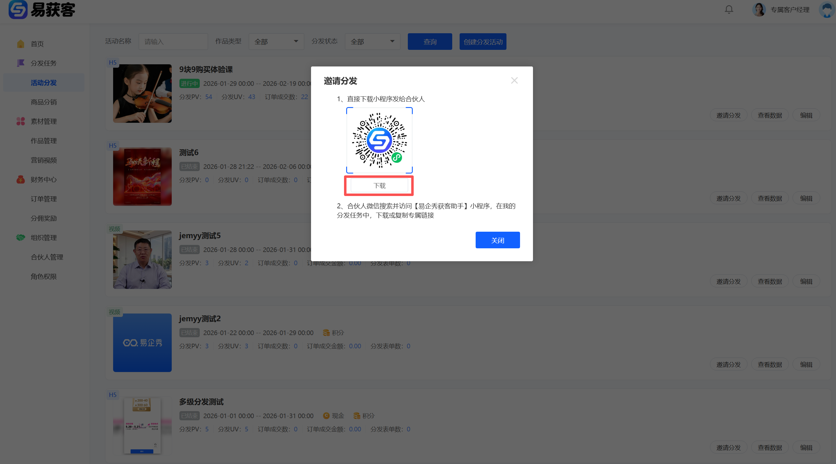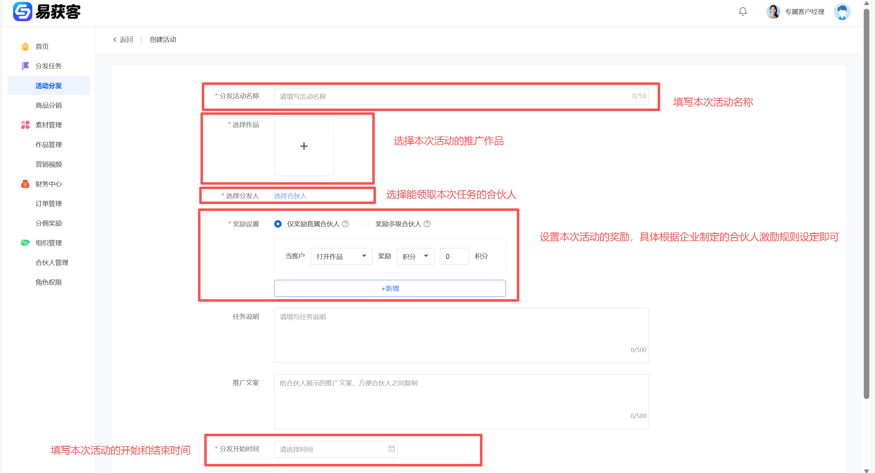 1、登录易获客管理中心后,在左侧菜单点击【活动分发】,进入活动管理页面,点击【创建分发活动】,进入活动创建页面。  2、进入活动创建页面后,按要求完成活动信息填写,信息确认无误后,点击【保存】,完成活动创建。  3、返回【活动管理】页面,在活动列表中找到刚创建的活动;点击对应活动右侧的【邀请分发】按钮;系统将生成本次活动的分发任务二维码;下载二维码图片,并发送至合伙人群聊,通知合伙人扫码领取任务。合伙人扫码后才能生成本次活动的专属推广链接,参与本次活动分发。